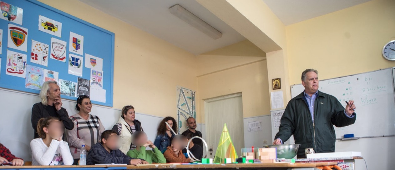 Ο κος Απόστολος Παπανικολάου, Ερευνητής της Διδακτικής των Μαθηματικών και συνεργάτης του Μουσείου, κατά τη διάρκεια της διδασκαλίας, παρουσία του κου Μιχάλη Πετρόπουλου, Δημάρχου της Ίου και της κας Άντζελας Φάκου, Προέδρου της Τουριστικής Επιτροπής Ίου