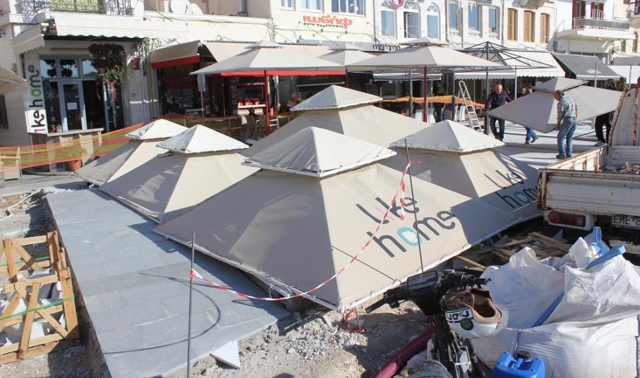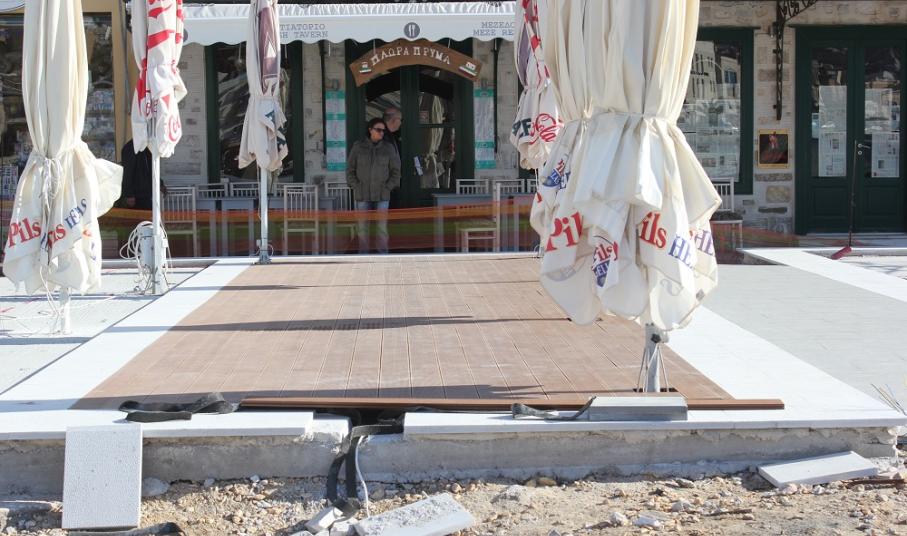 Προκειμένου να μπορέσουν οι επιχειρηματίες να αναπτύξουν τα τραπεζοκαθίσματα στον εξωτερικό χώρο που θα μισθώνουν, ήδη βρίσκονται σε εξέλιξη οι εργασίες τοποθέτησης του ειδικού δαπέδου. Παλέτες με τμήματα που επαρκούν για την κάλυψη των συνολικών τετραγωνικών μέτρων μπροστά από τις επιχειρήσεις, έχουν μεταφερθεί στο παραλιακό τμήμα, με πέντε τουλάχιστον εργάτες να προχωρούν στις σχετικές παρεμβάσεις. Αν και δεν μπορούν να υπάρξουν εκτιμήσεις για τον χρόνο υλοποίησης των συγκεκριμένων εργασιών, ωστόσο, η επίτευξη του στόχου στον καλύτερο δυνατό χρόνο αξιολογείται τουλάχιστον επιβεβλημένη.
