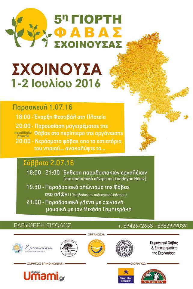 Φέτος, για πρώτη χρονιά η Γιορτή θα διαρκέσει δύο ημέρες. Το φεστιβάλ, που συνδιοργανώνουν ο Σύλλογος Σχοινουσιωτών, ο Σύλλογος Νέων Σχοινούσας, η Δημοτική Κοινότητα Σχοινούσας, το ΝΟΠΠΑΠΠΠΑ, ο Δήμος Νάξου & Μικρών Κυκλάδων και παραγωγοί φάβας ξεκινάει την Παρασκευή 1 Ιουλίου στις 18:00, στην κεντρική πλατεία του χωριού. Λίγο αργότερα, θα γίνει παρουσίαση μαγειρέματος, ενώ παράλληλα, οι επισκέπτες θα μπορούν να περπατήσουν στο χωριό, δοκιμάζοντας κεράσματα φάβας από τα εστιατόρια του νησιού.