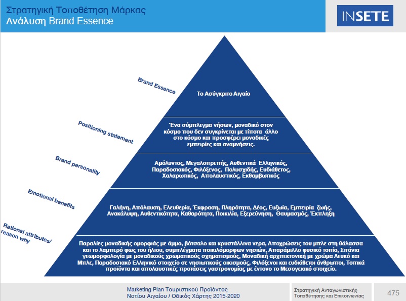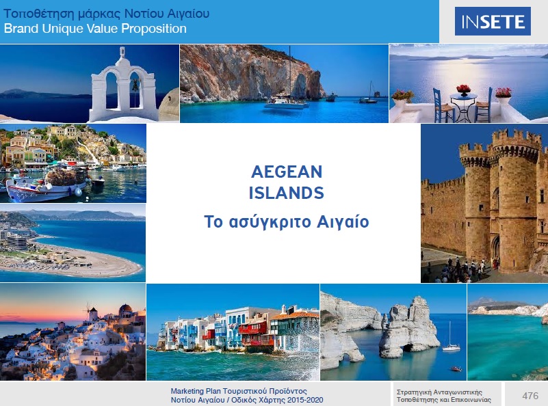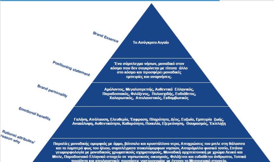 Ενδεικτικά, για τις στρατηγικές ανάγκες προτείνεται, «το επίπεδο Νότιο Αιγαίο χρήζει τοποθέτησης με έννοιες σχετικές τόσο με το γεωγραφικό προσδιορισμό «Aegean Islands», όσο και με τα μοναδικά στοιχεία στο σύνολό τους. Για τα επίπεδα των Δωδεκανήσων και των Κυκλάδων υφίσταται η ανάγκη για αύξηση της αναγνωρισιμότητας από τους επισκέπτες των νησιών του Αιγαίου που γνωρίζουν και ενδιαφέρονται για έναν τελικό προορισμό, το νησί (π.χ.Μύκονος) ή γενικά τα Ελληνικά νησιά του Αιγαίου».