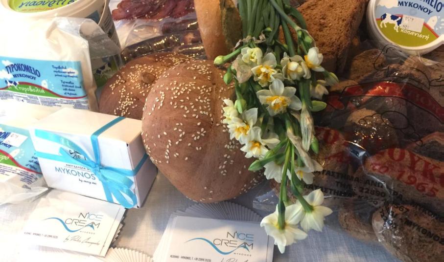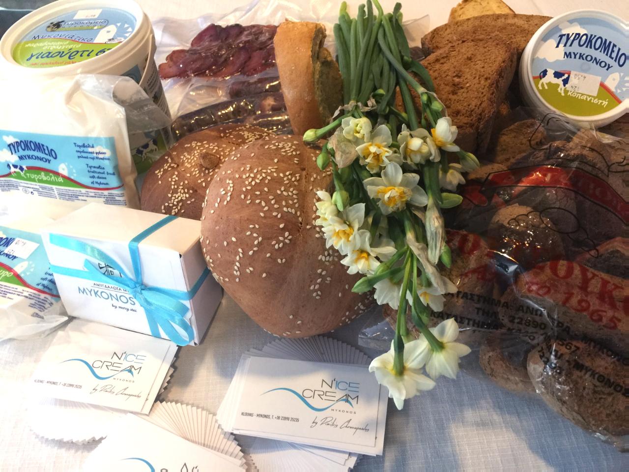 Κατά τη διάρκεια της δράσης, παρουσιάστηκαν τα μυκονιάτικα προϊόντα, ξινότυρο, τυροβολιά, γιαούρτι, κοπανιστή, (Τυροκομείο Μυκόνου) λούζα, λουκάνικα (Κρεοπωλείο Μενάγιας), καθώς και προϊόντα αρτοποιίας όπως μυκονιάτικο παξιμάδι, σταφιδόψωμο, άρτος (Αρτοποιία Κουτσούκος). Αυτή τη φορά εκτός από την ιστορία του παξιμαδιού και τον ρόλο του στην οικονομία του νησιού, παρουσιάστηκε και το μυκονιάτικο χριστόψωμο με τους συμβολισμούς του.