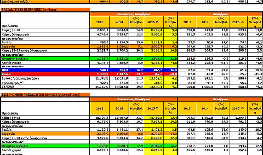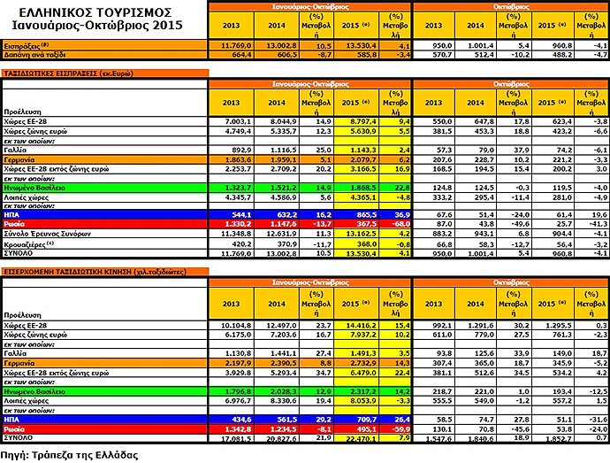Τα στοιχεία της ΤτΕ ΕΛΛ 0,00% δείχνουν πως στο διάστημα Ιανουαρίου-Οκτωβρίου φέτος η Ελλάδα υποδέχθηκε 1,8 εκατ. περισσότερους ξένους επισκέπτες σε σύγκριση με το 2014 (22,47 εκατ. έναντι 20,8 το 2014), αλλά οι εισπράξεις αυξήθηκαν μόλις 500 εκατ. ευρώ (13 δισ. ευρώ το 2014 και 13,53 δισ. ευρώ φέτος).