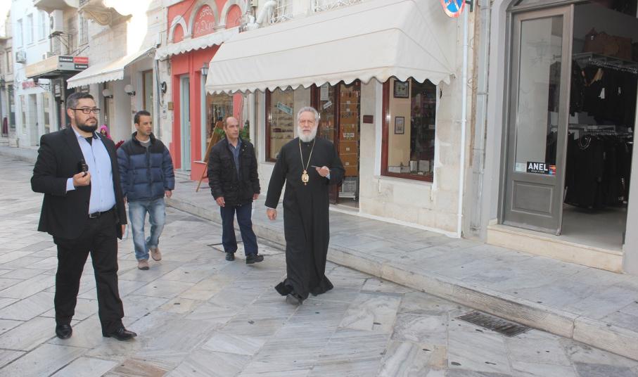 Κατά τη διάρκεια της επίσκεψής του στους εμπορικούς δρόμους της Ερμούπολης, ο Σεβασμιώτατος συζήτησε με τους επιχειρηματίες, δέχτηκε τις συμβουλές τους για όμορφα και πρωτότυπα χριστουγεννιάτικα δώρα και μοίρασε σε όλους εικονάκια του Αγίου Βασιλείου.