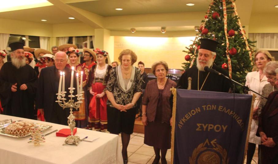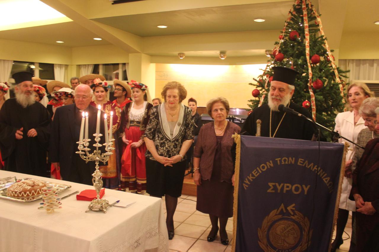 Η πρόεδρος, αφού ευχαρίστησε τους υπεύθυνους των τμημάτων χορού, παραδοσιακών οργάνων, του εργαστηρίου ζωγραφικής αλλά και του νέου τμήματος γραμμικού σχεδίου, έδωσε το λόγο στον Σεβασμιώτατο Μητροπολίτη Σύρου κ. Δωρόθεο Β’. Χαρακτηρίζοντας το Λύκειο Ελληνίδων Σύρου έναν από τους πολυτιμότερους λίθους στο πολιτιστικό περιδέραιο της ευλογημένης Σύρου, ο κ. Δωρόθεος επεσήμανε την επιτακτική ανάγκη συνέχισης της παράδοσής μας σε μια εποχή, η οποία προσπαθεί να αποδομήσει και αποσκορακίσει αρχές και ηθικές αξίες και παραδόσεις. Στη συνέχεια, ο κ. Δωρόθεος Β’ ευλόγησε και έκοψε την πίτα μαζί με τον π. Αντώνιο Βουτσίνο, ενώ ακολούθησε μουσικό πρόγραμμα από τους Δημήτρη Σούλιο, Ειρήνη Σιγάλα και Μέμη Ροσσολάτο.