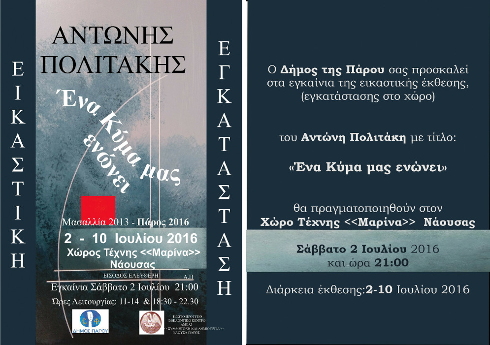 Ο Δήμος της Πάρου, έχει την ιδιαίτερη τιμή και χαρά, να φιλοξενήσει από το Σάββατο 2 Ιουλίου μέχρι και την Κυριακή 10 Ιουλίου 2016 στο χώρο Τέχνης «Μαρίνα» στην Νάουσα την Εικαστική Έκθεση (εγκατάσταση στο χώρο του αναγνωρισμένου εικαστικού Αντώνη Πολιτάκη, με τίτλο: «Ένα κύμα μας ενώνει», ), η οποία επιλέχθηκε από τους φορείς ως ένα από τα πλέον αντιπροσωπευτικά έργα της σύγχρονης δημιουργίας για να αντιπροσωπεύσει την χώρα μας και τον Πειραιά (πόλη που γεννήθηκε) στην Πολιτιστική πρωτεύουσα της Ευρώπης την Μασσαλία το 2013.