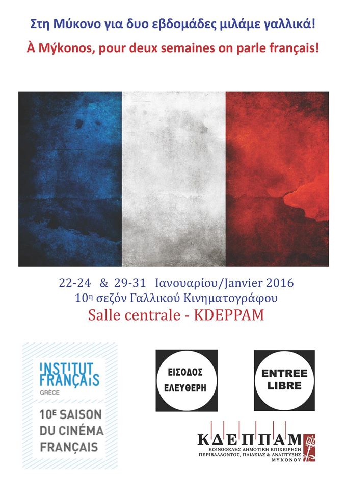 Τα γαλλικά της φρεσκάρει για 10η συνεχή χρονιά η Μύκονος, στο πλαίσιο της αγαστής συνεργασίας της με το Γαλλικό Ινστιτούτο, που προσφέρει και φέτος στους σινεφίλ κατοίκους της την ευκαιρία να απολαύσουν μερικές από τις καλύτερες στιγμές του Γαλλικού Κινηματογράφου.
