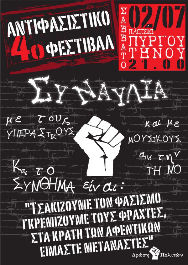 Με τις σκέψεις αυτές σας καλούμε να συμμετέχετε στο 4ο αντιφασιστικό φεστιβάλ στην πλατεία του Πύργου της Τήνου, το Σάββατο 2 και την Κυριακή 3 Ιουλίου στις 21.00.