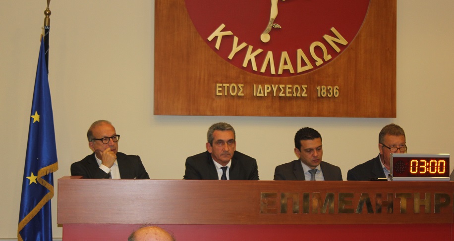 Η πρώτη συνεδρίαση του περιφερειακού συμβουλίου για το 2016 πραγματοποιήθηκε στην πλήρως ανανεωμένη και σύγχρονη πλέον αίθουσα του Επιμελητηρίου Κυκλάδων, με τον πρόεδρό της, Γιάννη Ρούσσο να υποδέχεται τους συμβούλους σε μία πρώτη δοκιμαστική λειτουργία του χώρου και του νέου εξοπλισμού.