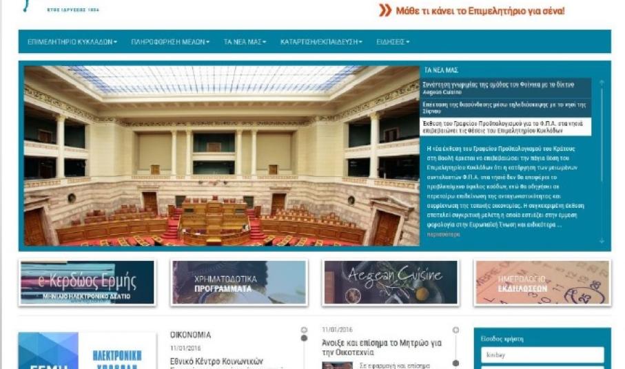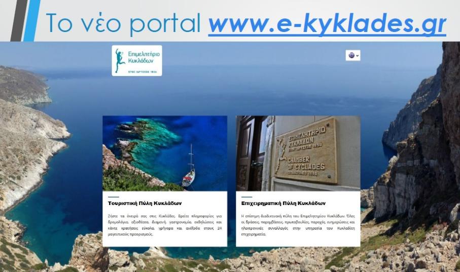 Αέρας ανανέωσης κι εμφανούς αναβάθμισης χαρακτηρίζει και το επιχειρηματικό και τουριστικό portal του Επιμελητηρίου Κυκλάδων, το περιεχόμενο του οποίου εμπλουτίστηκε σημαντικά. Οι κυριότερες αλλαγές εστιάζονται στο πολυγλωσσικό περιεχόμενο (δυνατότητα μετάφρασης σε 7 γλώσσες). Η επίσκεψη και παραμονή των χρηστών σε αυτό (e-kyklades.gr), παρέχει συνεχή κι έγκυρη ενημέρωση σε επιχειρηματικά θέματα, ενώ είναι πλέον εφικτή και η δυνατότητα ηλεκτρονικής διοικητικής εξυπηρέτησης.