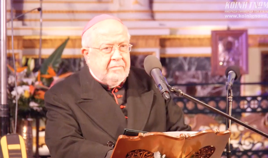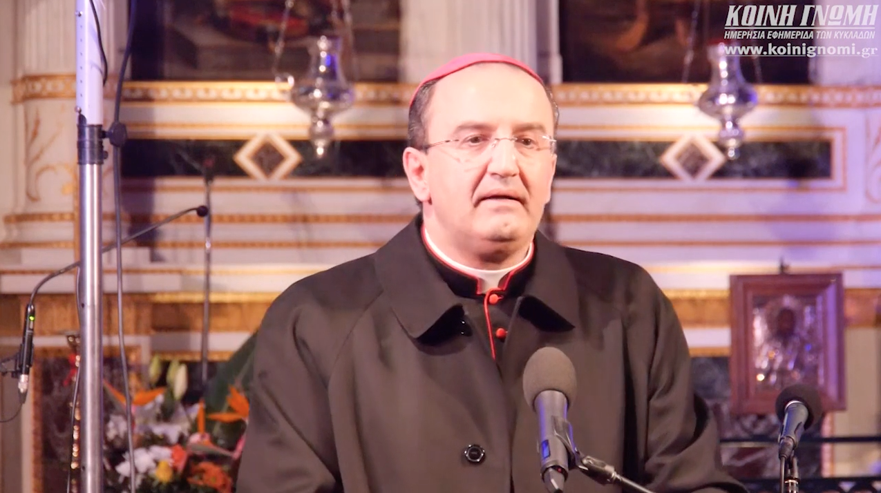 Την ειλικρινή χαρά και ευγνωμοσύνη του για την τιμή που του επιφύλαξε ο Κύριος να συμπορεύεται μαζί με τον Μητροπολίτη Σύρου κ. Δωρόθεο Β’ σε μια πορεία ενότητας και ειρήνης στην καθοδήγηση του ποιμνίου, εξέφρασε με τη σειρά του ο Καθολικός Επίσκοπος Σύρου Σεβ. π. Πέτρος Στεφάνου. Μοιράστηκε μάλιστα μαζί με τους παρευρισκόμενους τις μνήμες τους από την ημέρα εκείνη, όπου ο λαός της Σύρου υποδέχτηκε με ενθουσιασμό τον Σεβασμιώτατο, αναγνωρίζοντας στο πρόσωπό του έναν σπάνιο, συνετό λειτουργό της χριστιανικής πίστης και στοργικό πατέρα, που διακρίνεται για την αγάπη του στο συνάνθρωπο, τη δημιουργικότητά του, αλλά και την πίστη του στον Θεό.