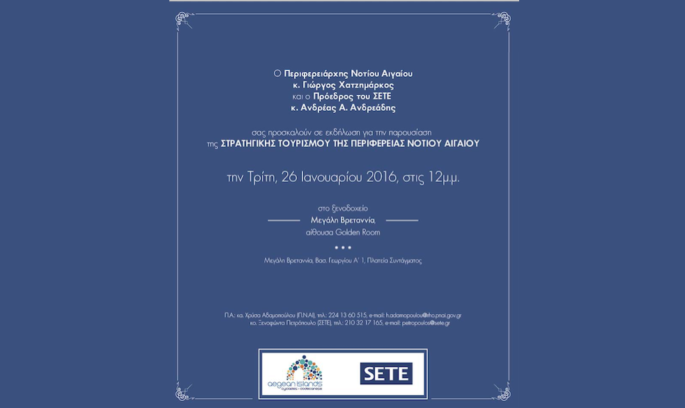 Υπενθυμίζεται πως, εκπονήθηκε σε συνεργασία με τον InSETE αλλά και την Marketing Greece και αποτελεί μία ολοκληρωμένη μελέτη τουρισμού για το Νότιο Αιγαίο.