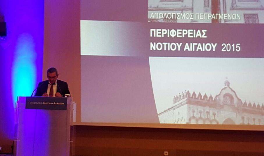 “Η έκρηξη των προσφυγικών και μεταναστευτικών ροών στα νησιά μας, η απώλεια των μειωμένων συντελεστών ΦΠΑ και η αιφνιδιαστική περικοπή του χρηματοδοτικού πλαισίου ΕΣΠΑ της περιόδου, σε συνδυασμό με την ευρύτερη δημοσιονομική κατάσταση της χώρας μας, διαμόρφωσαν το εκρηκτικό περιβάλλον που απείλησε να μετατρέψει το DNA της Περιφέρειας μας, τη νησιωτική φύση της, από ευλογία σε κατάρα. Παρά τις πρωτοφανείς δυσκολίες, στέκομαι σήμερα απέναντι σε εσάς και στους συμπατριώτες μας παρουσιάζοντας έναν απολογισμό δράσης που θα μπορούσε κάλλιστα να αποτελεί απολογισμό περιόδου “ειρήνης” και “ευημερίας”” δήλωσε χαρακτηριστικά ο Περιφερειάρχης, προχωρώντας στην παρουσίαση των πεπραγμένων.