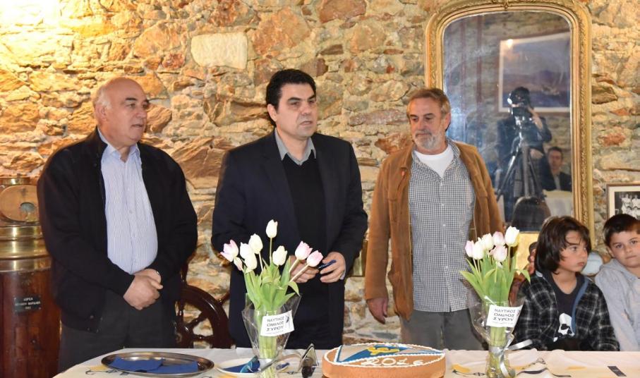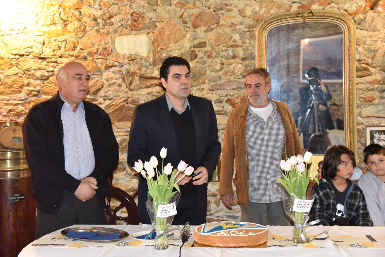 Ο πρόεδρος της επιτροπής αθλητισμού του δήμου Σύρου-Ερμούπολης είπε: "Ο Ναυτικός Όμιλος Σύρου είναι ένα ζωντανό κύτταρο της κοινωνίας μας και όλα αυτά τα χρόνια έχει αποδείξει ότι είναι παρών σε όλες τις μεγάλες διοργανώσεις. Ο Όμιλος έχει αναδείξει μεγάλους αθλητές όπως είναι ο Γιάννης Γρυπάρης, αλλά και ο Αντώνης Μπουγιούρης. Εμείς ως δήμος θα είμαστε δίπλα στον Ναυτικό Όμιλο Σύρου, μάλιστα θα συνδιοργανώσουμε εκδηλώσεις το καλοκαίρι του 2016". Στη συνέχεια απεύθυνε τις ευχές του ο διοικητής του λιμενικού σώματος και ο αντιπρόεδρος της ΚΟΕ Δημήτρης Γρυπάρης. Από την πλευρά του ο αντιπρόεδρος της ΚΟΕ τόνισε πως θα πρέπει να στηριχθεί ο Ν.Ο. Σύρου καθώς είναι ένας Όμιλος ο οποίος έχει φέρει τεράστιες επιτυχίες στο νησί. Ακόμη πως για να συνεχίζει να παράγει ταλέντα θα πρέπει το κολυμβητήριο της Ερμούπολης να παραμένει ανοικτό όλο τον χρόνο κι όχι κάποιους μόνο μήνες. Ο κ. Γρυπάρης τέλος, ευχήθηκε μία καλή χρονιά σε όλους με υγεία.