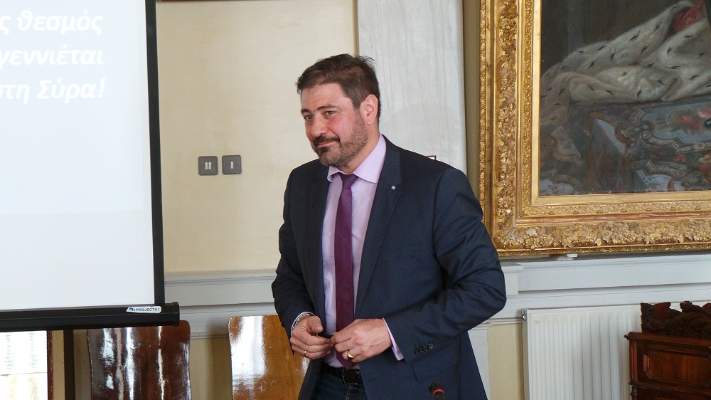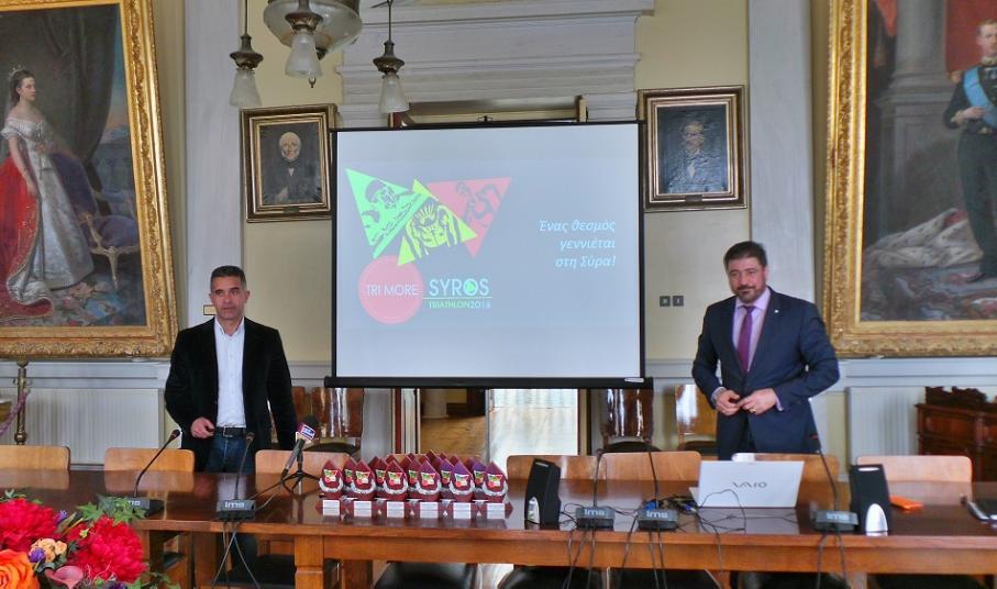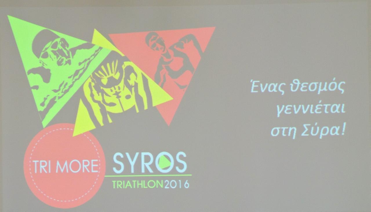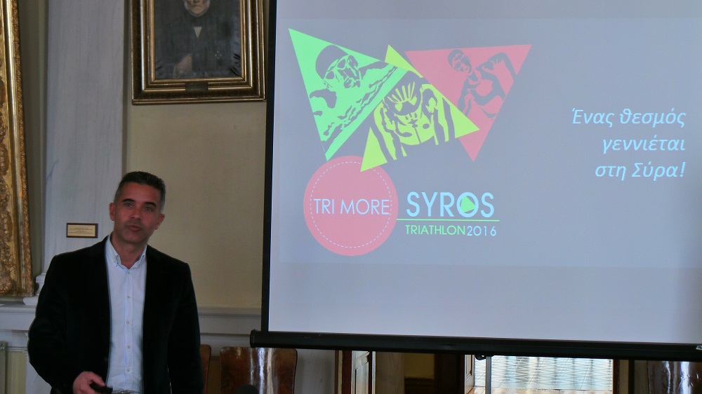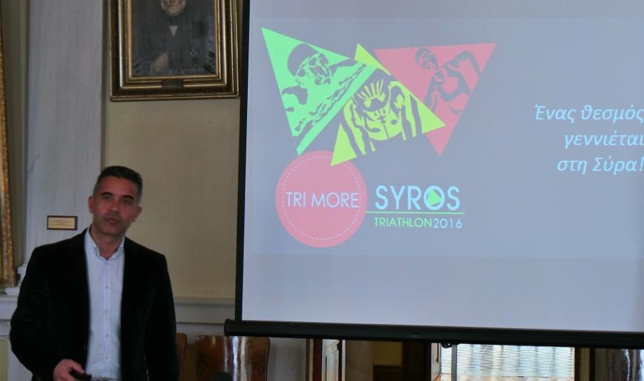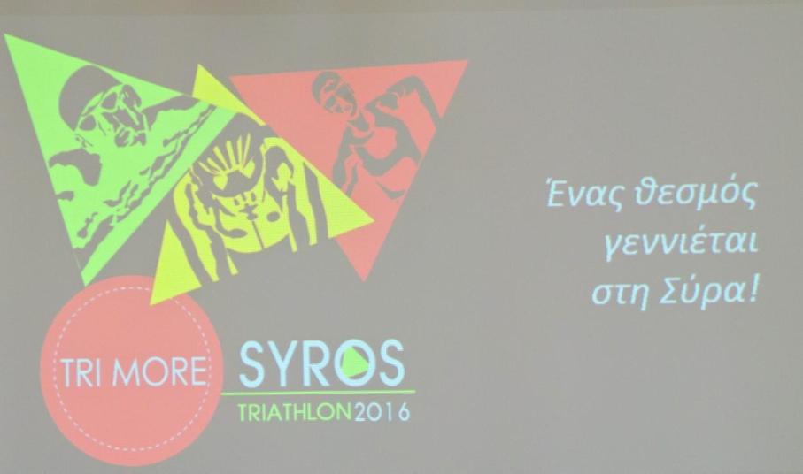 Στην αίθουσα συνεδριάσεως του δημοτικού Συμβουλίου του Δήμου Σύρου-Ερμούπολης πραγματοποιήθηκε η συνέντευξη Τύπου - παρουσίαση του "1ου Trimore Syros Triathlon 2016", που θα πραγματοποιηθεί στην Ερμούπολη στις 10 έως 12 Ιουνίου. Κατά τη διάρκεια της συνέντευξης μίλησε ο Δήμαρχος Σύρου - Ερμούπολης Γιώργος Μαραγκός, ο οποίος παρουσίασε τον αγώνα τριάθλου, αλλά και κάλεσε όλους τους κατοίκους του νησιού να σταθούν δίπλα στην εκδήλωση αυτή, ώστε να γνωρίσει μεγάλη επιτυχία και η εκδήλωση αυτή να γίνει θεσμός στο νησί. "Είναι μία διοργάνωση στην οποία έχουμε πιστέψει πάρα πολύ και είναι μία διοργάνωση την οποία θέλουμε να καταστήσουμε θεσμό για το νησί μας. Η προσήλωση στον στόχο, η προσπάθεια και η συγκέντρωση αποτελούν στοιχεία που για εμάς τους Συριανούς, αλλά και για τη δημοτική αρχή, ταιριάζουν στην ιδιοσυγκρασία μας. Εξαρχής όταν τέθηκε από μέρους της trimore και του κ. Μητρόπαπα η πρόταση να διοργανώσουμε μία τέτοια εκδήλωση στο νησί, είμαστε ένθερμοι υποστηρικτές, αφού θέλαμε πραγματικά να συνεισφέρουμε με κάθε τρόπο σ' αυτή τη διοργάνωση" είπε μεταξύ άλλων ο Δήμαρχος Σύρου-Ερμούπολης κ. Μαραγκός.