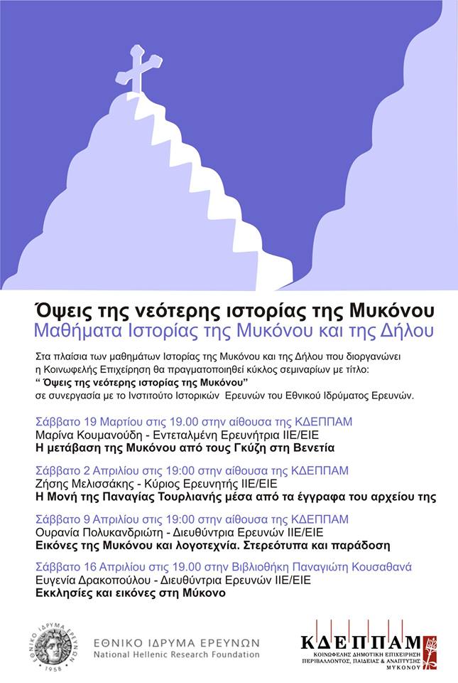 Οι σημαντικότερες στιγμές της νεότερης ιστορίας της Μυκόνου από την κυριαρχία των Ενετών αδελφών Ανδρέα και Ιερεμία Γκύζη μέχρι την προσάρτησή της στη Βενετία, το πλούσιο πολιτιστικό υπόβαθρο του νησιού, αλλά και οι πολυάριθμες εκκλησίες του, θα παρουσιαστούν προσεχώς μέσα από τον νέο κύκλο σεμιναρίων της ΚΔΕΠΠΑΜ.