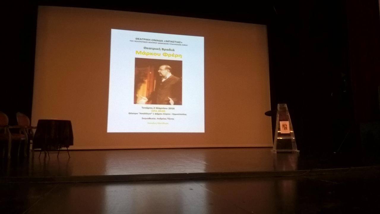 Ένα ακόμη αξιόλογο αφιέρωμα στη ζωή, το έργο και την πολυσχιδή προσφορά του αείμνηστου Μάρκου Φρέρη στην πολιτιστική ζωή του νησιού, παρουσίασε στο Θέατρο Απόλλων η Θεατρική Ομάδα «Μπαστιάς» του Πολιτιστικού Κέντρου Δημοσίων Υπαλλήλων Σύρου.