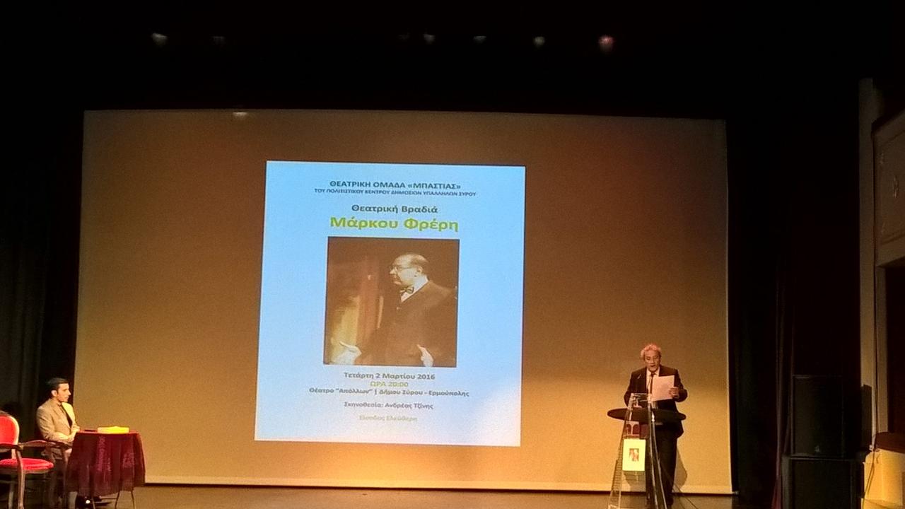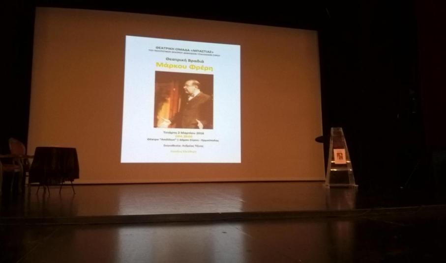 Μετά από μια σύντομη ομιλία από τον Γιάννη Ρούσσο, προβλήθηκε από απόσπασμα από εκπομπή του Μάρκου Φρέρη στο Σύρος TV1, ενώ αναγνώστηκε το κείμενό του ‘Από τη θεατρική ιστορία της Ερμούπολης», που δημοσιεύθηκε στο βιβλίο «Μάρκος Φρέρης: Ένας Συριανός Διανοούμενος». Το βιβλίο εκδόθηκε το 2010 από το Δήμο Ερμούπολης.