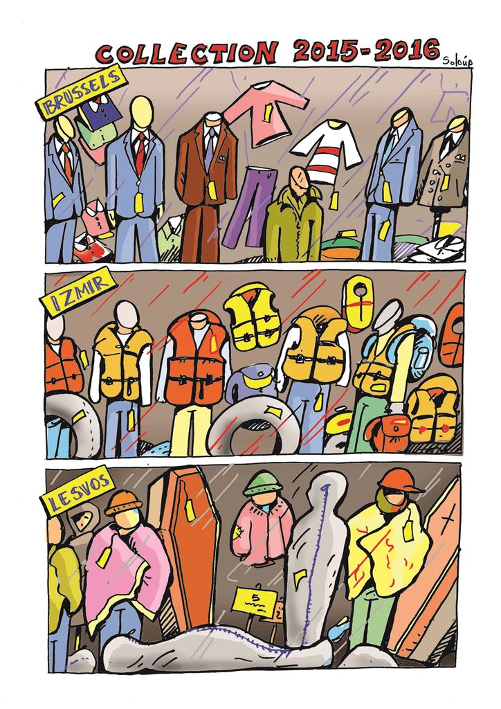Ο κ. Πάνος Μαραγκός, Πρόεδρος της Λέσχης Ελλήνων Γελοιογράφων, από την πλευρά του τόνισε, ότι «η έκθεση που εγκαινιάζεται σήμερα έχει διττό στόχο: Αφ’ ενός, να δηλώσουμε την ενεργή συμπαράσταση και στήριξή μας αλλά και να υποκλιθούμε στο ακάματο έργο των απλών ανθρώπων, και κυρίως των νησιωτών μας, που παραδίδουν διαρκή μαθήματα ανθρωπισμού και αλληλεγγύης προς όλον τον πολιτισμένο κόσμο, αφ’ ετέρου, να στείλουμε ένα μήνυμα σε όλες τις χώρες, μήνυμα που χάρη στη διεθνή γλώσσα του σκίτσου μπορεί να γίνει πιο εύκολα αντιληπτό σε σχέση με άλλες μορφές παρέμβασης. Δεν είναι τυχαίο που 28 γελοιογράφοι, μέσα από ένα μωσαϊκό διαφορετικών απόψεων, ιδεολογιών, νοοτροπιών αλλά και τεχνοτροπιών και εκφραστικών μέσων, οδηγούνται σε μια κοινή συνισταμένη, εύκολα αντιληπτή στους επισκέπτες της έκθεσης».
