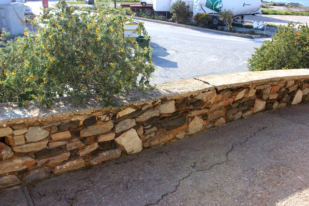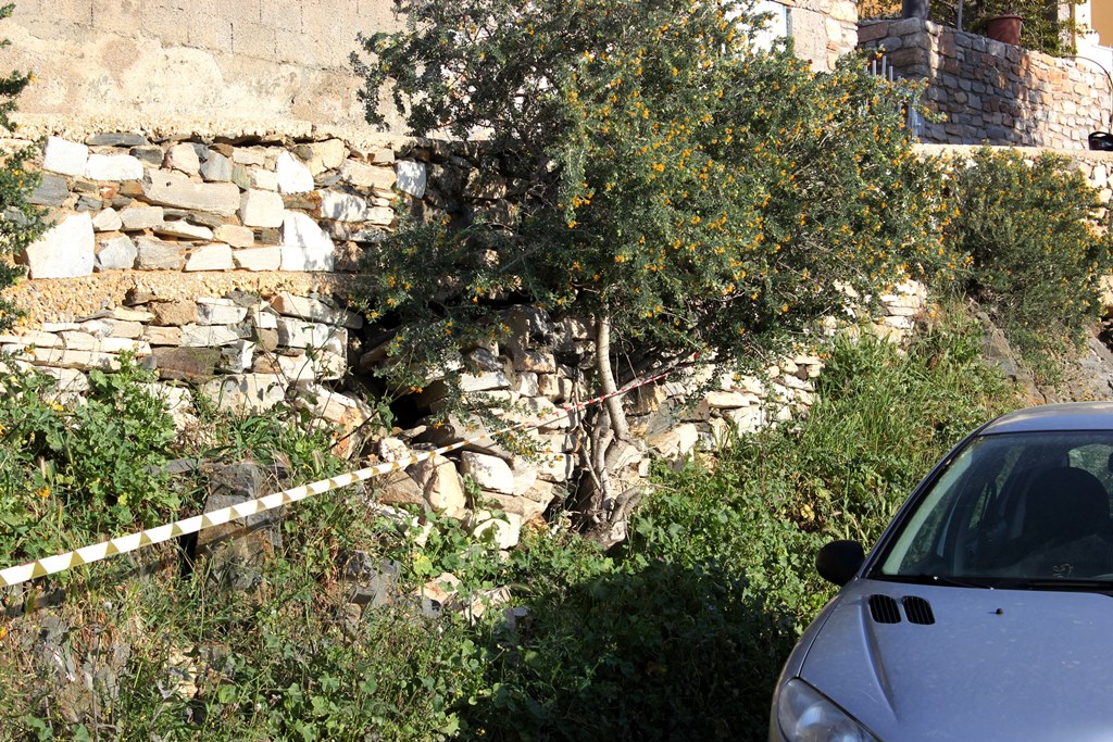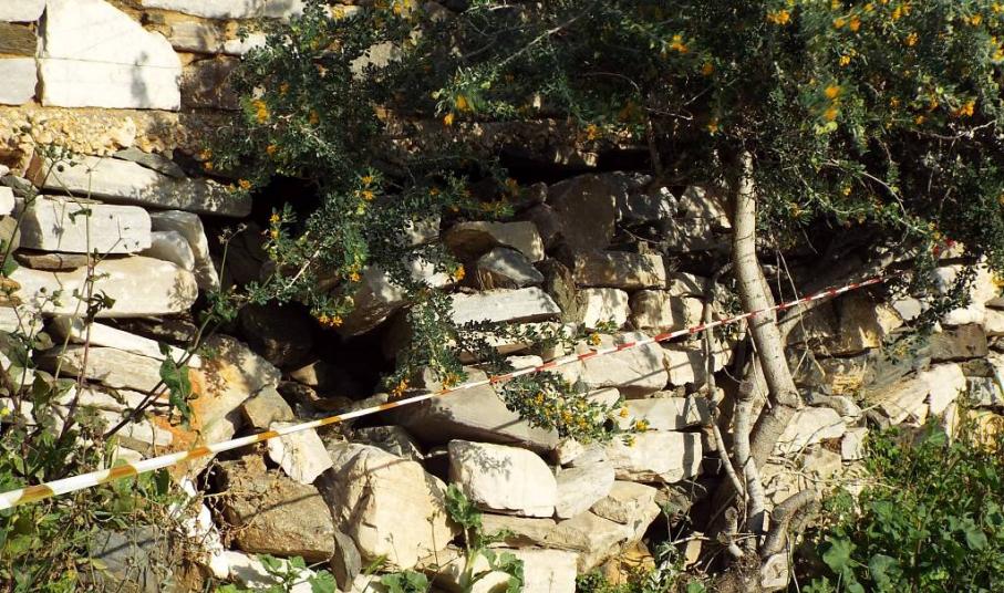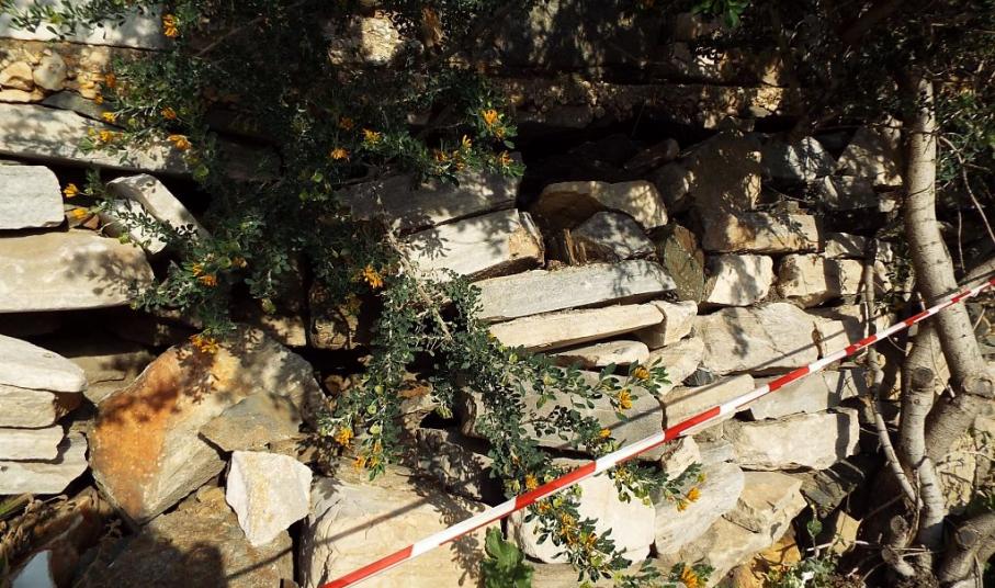 Με την πάροδο του χρόνου, οι πέτρες του τοιχίου σε συγκεκριμένο σημείο έχουν μετακινηθεί αρκετά προς τα έξω, με αποτέλεσμα αρκετές από αυτές να έχουν καταρρεύσει, ενώ οι υπόλοιπες, λόγω της μετακίνησης, να μην είναι ικανές να συγκρατήσουν το χώμα, στην εσωτερική πλευρά του τοίχου.