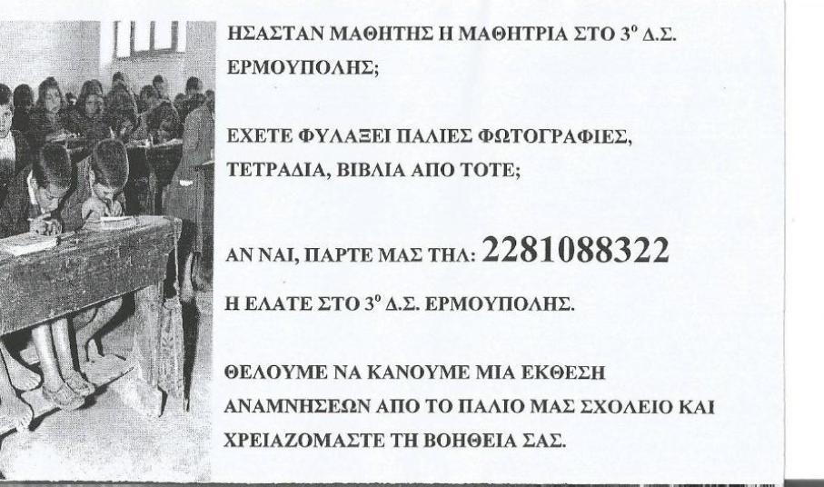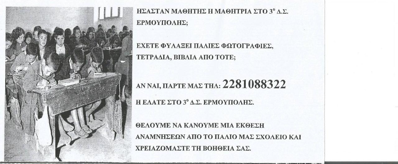 Επισημαίνεται πως, όποιος επιθυμεί να δανείσει στο σχολείο τις δικές του «αναμνήσεις», μπορεί να επικοινωνήσει στο 22810 88322 ή να επισκεφτεί το 3ο Δημοτικό Σχολείο Ερμούπολης.