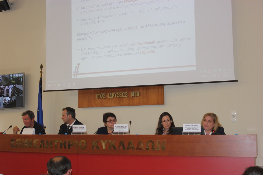 Στην ενημέρωση του συνόλου των ενδιαφερομένων επιχειρηματιών στις Κυκλάδες αναφορικά με τέσσερις νέες δράσεις του Επιχειρησιακού Προγράμματος “Ανταγωνιστικότητα, Επιχειρηματικότητα και Καινοτομία 2014 – 2020” προχώρησε το Επιμελητήριο Κυκλάδων από κοινού με την Εταιρεία Ανάπτυξης και Προόδου Κυκλάδων (ΕΤΑΠ) το μεσημέρι του Σαββάτου, με τους υπεύθυνους ομιλητές να παρουσιάζουν τα βασικά σημεία στους παρευρισκομένους των γραφείων του Επιμελητηρίου σε Σύρο, Άνδρο, Θήρα, Μήλο, Μύκονο, Νάξο και Πάρο.