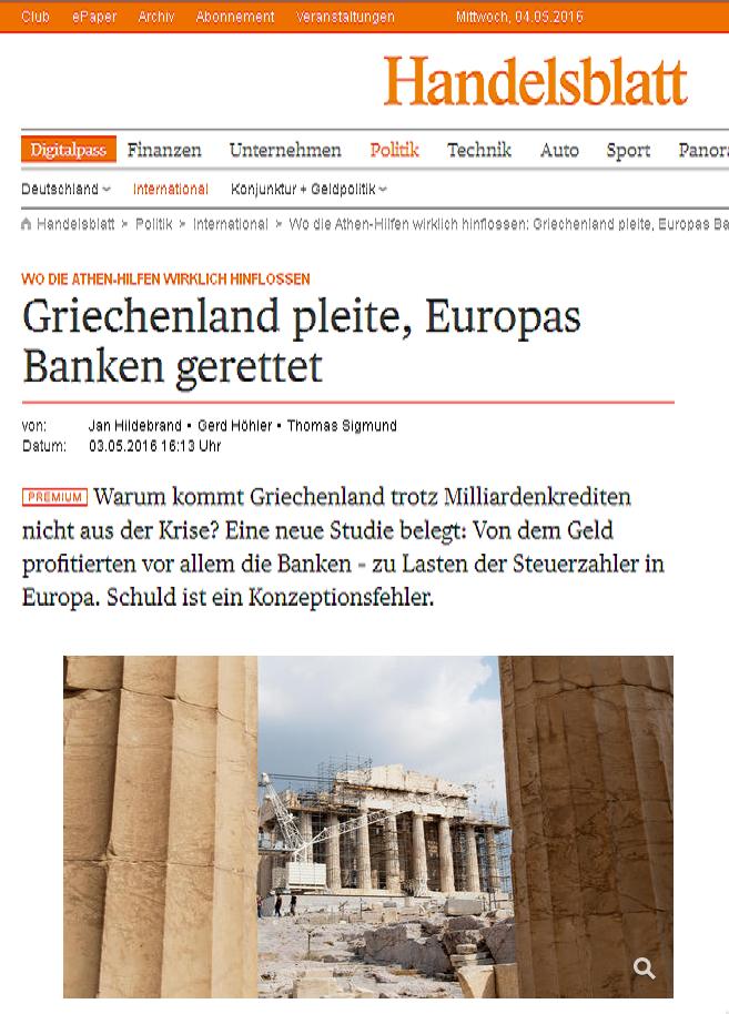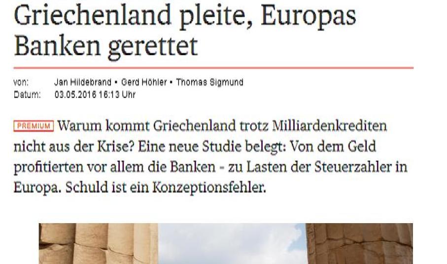 Για ότι δε αφορά στα μέτρα που επιβάλλονται λόγω του δανεισμού, ενώ όλα λειτουργούν προς όφελος των τραπεζών σημειώνει ότι «Πρόκειται για κάτι που υπέθεταν όλοι αλλά το γνώριζαν λίγοι και επιβεβαιώνεται τώρα από την εν λόγω έρευνα: Εδώ και έξι χρόνια η Ευρώπη προσπαθεί μάταια να τερματίσει την κρίση στην Ελλάδα με δάνεια και απαιτεί συνεχώς σκληρότερα μέτρα και μεταρρυθμίσεις. H αιτία της αποτυχίας βρίσκεται όμως προφανώς λιγότερο στην πλευρά της ελληνικής κυβέρνησης και περισσότερο στο σχεδιασμό των προγραμμάτων βοήθειας».