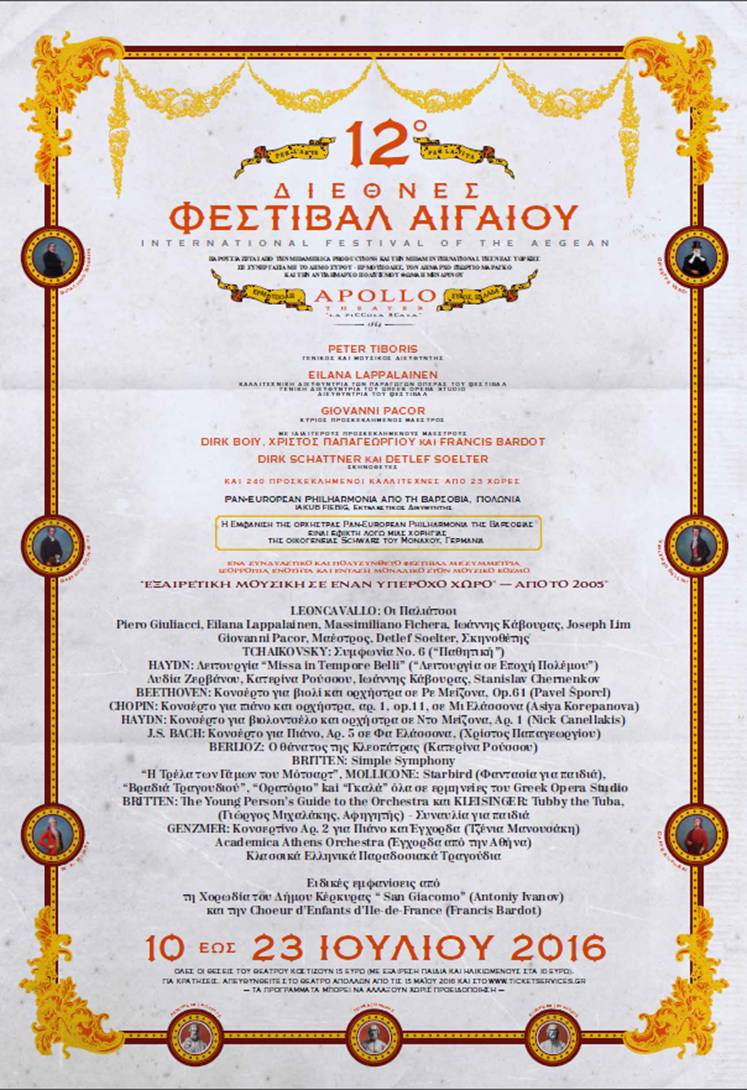 Το 12ο Ετήσιο Διεθνές Φεστιβάλ Αιγαίου φέτος θα πραγματοποιηθεί από τις 10 έως τις 23 Ιουλίου 2016 στη Σύρο από την Midamerica Productions και την MidAm International της Νέας Υόρκης σε συνεργασία με το Δήμο Σύρου – Ερμούπολης.