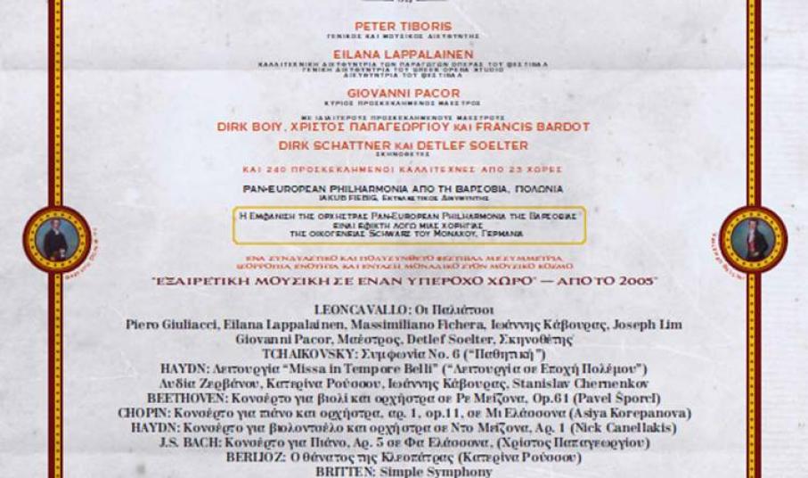 Η ορχήστρα που παίρνει φέτος μέρος είναι η Pan-European Philharmonia από τη Βαρσοβία, με την ευγενή χορηγία της οικογένειας Schwarz του Μονάχου της Γερμανίας. Εκτελεστικός διευθυντής της Pan-European Philharmonia είναι ο Jakub Feibig.