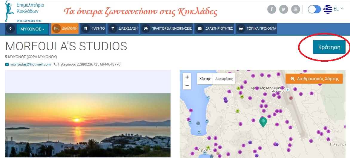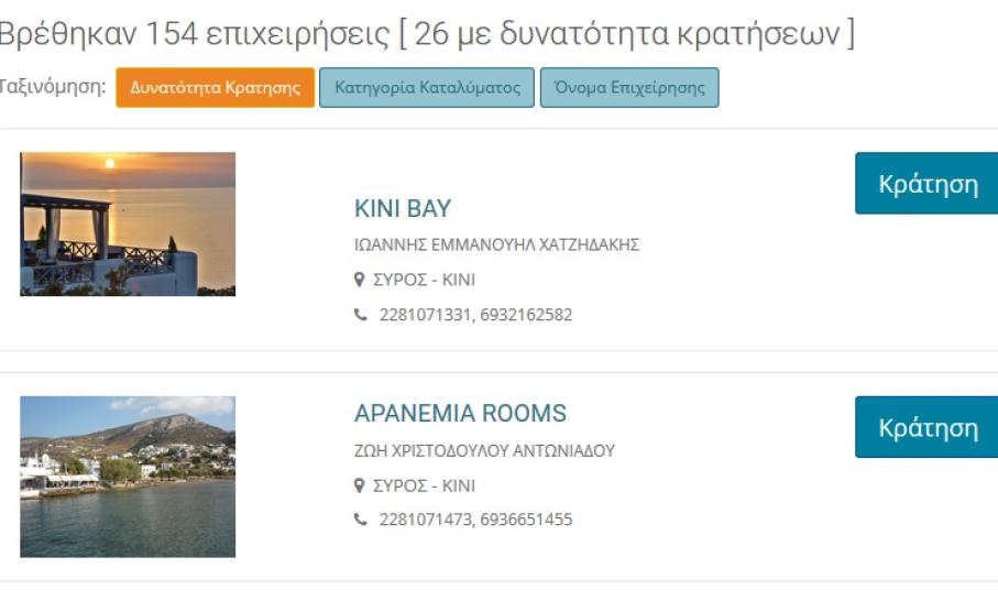 Η δυνατότητα άμεσης ηλεκτρονικής κράτησης (e-booking) προς τους εν δυνάμει επισκέπτες των τουριστικών καταλυμάτων των Κυκλάδων παρέχεται μέσω της σύγχρονης τουριστικής – επιχειρηματικής πλατφόρμας (www.e-κyklades.gr) του Επιμελητηρίου Κυκλάδων, η οποία προσφέρει πλέον ανανεωμένες τις σχετικές υπηρεσίες, προκειμένου οι καταλυματίες να αποκομίσουν σημαντικό τουριστικό όφελος.
