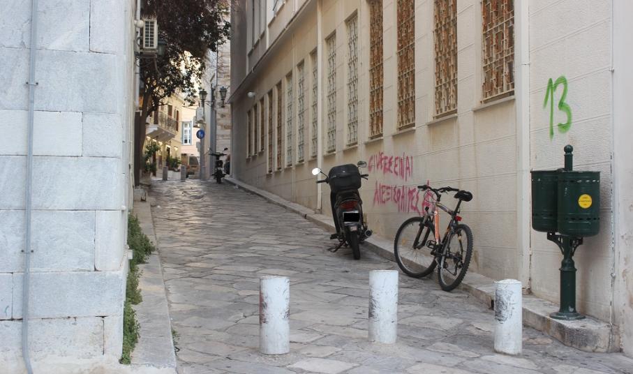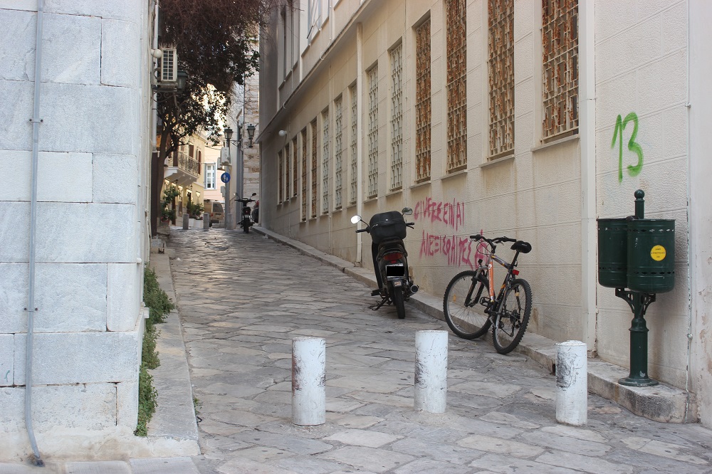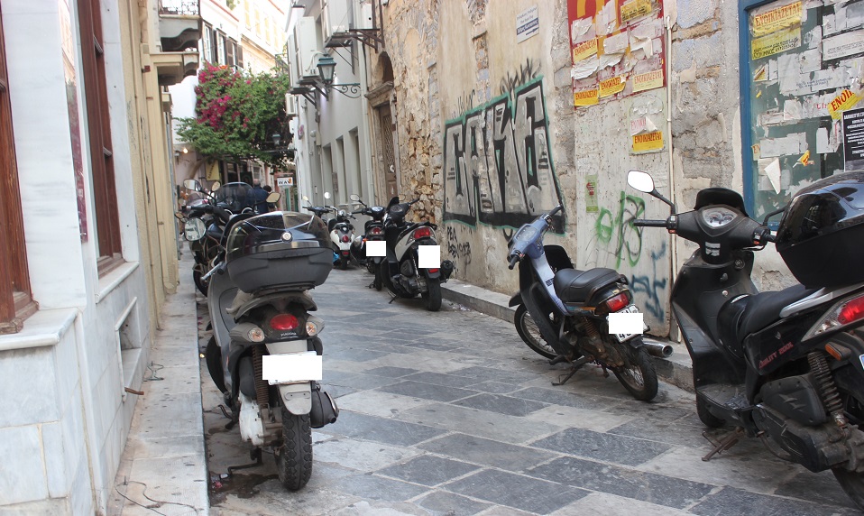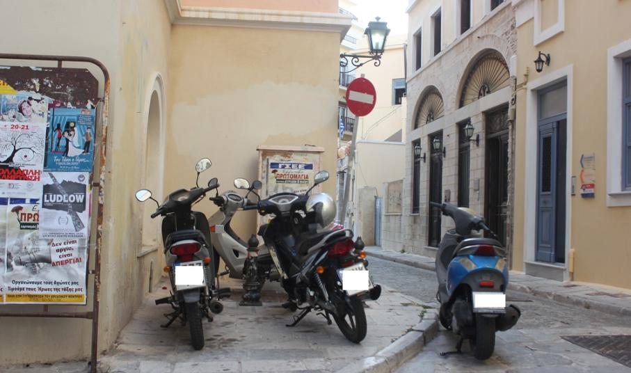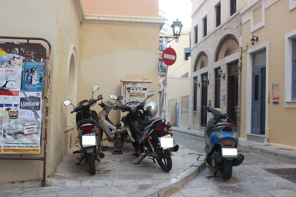 Κατειλημμένα από δίκυκλα είναι αρκετά πεζοδρόμια της πόλης, εσοχές για τη στάση των mini bus, μικρές οδοί από τις οποίες απαγορεύεται η διέλευσή τους, αλλά ακόμη και παραδοσιακά σοκάκια της Ερμούπολης, διαπίστωση που προδίδει την κυκλοφοριακή ασυνειδησία ορισμένων οδηγών, που αφήνει το στίγμα της, καθημερινά και που ως φαίνεται, καλά κρατεί.