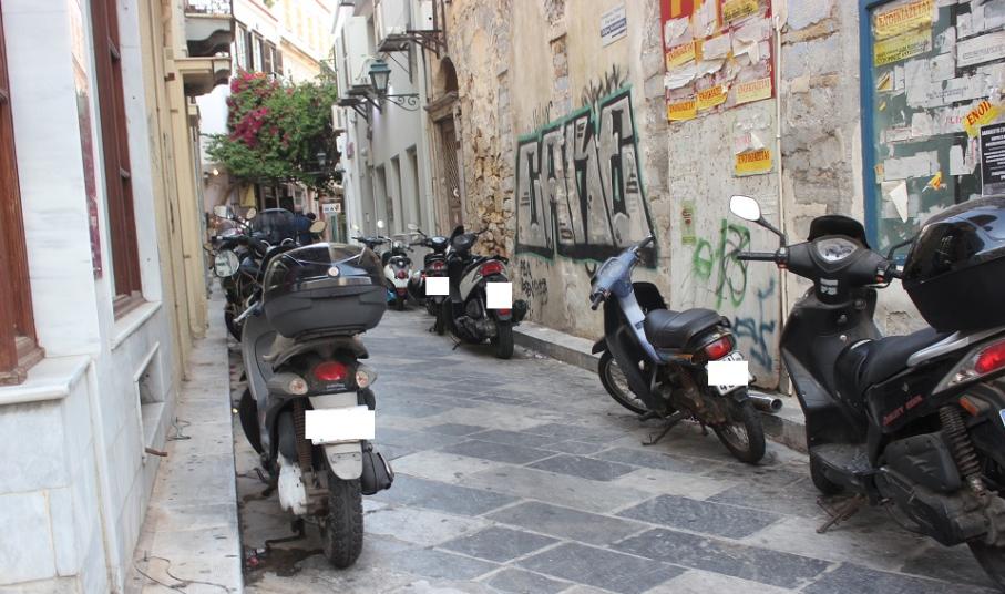 Ενδεικτικά μόνον παρουσιάζονται φωτογραφίες από πολλά σημεία της “καρδιάς” του κέντρου, όπου παρατηρούνται δίκυκλα να “κλείνουν” εισόδους μικρών πεζόδρομων στη συμβολή τους με την οδό Ελ. Βενιζέλου, άλλα, να καταλαμβάνουν ζωτικό χώρο σε μικρές οδούς καθιστώντας τες απροσπέλαστες για τους πεζούς, ενώ ακόμη, μερικά εξ αυτών να αφήνονται επί ώρες σε τμήματα πεζοδρομίων, όπως χαρακτηριστικά όπισθεν του θεάτρου Απόλλων αλλά και στο ύψος του Ι.Ν. του Αγίου Νικολάου στην έναρξη της συνοικίας Βαπόρια.