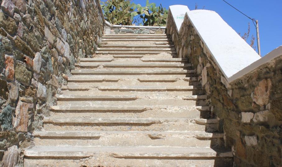 Σημαντικές φθορές παρατηρούνται στα σκαλοπάτια, που ξεκινούν από την περιοχή «Βαπόρια», στο ύψος του κτιρίου της Αστυνομικής Διεύθυνσης Κυκλάδων, με κατάληξη στην παραλία «Αστέρια».