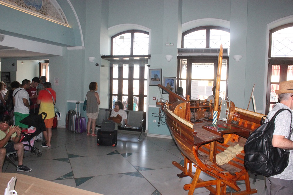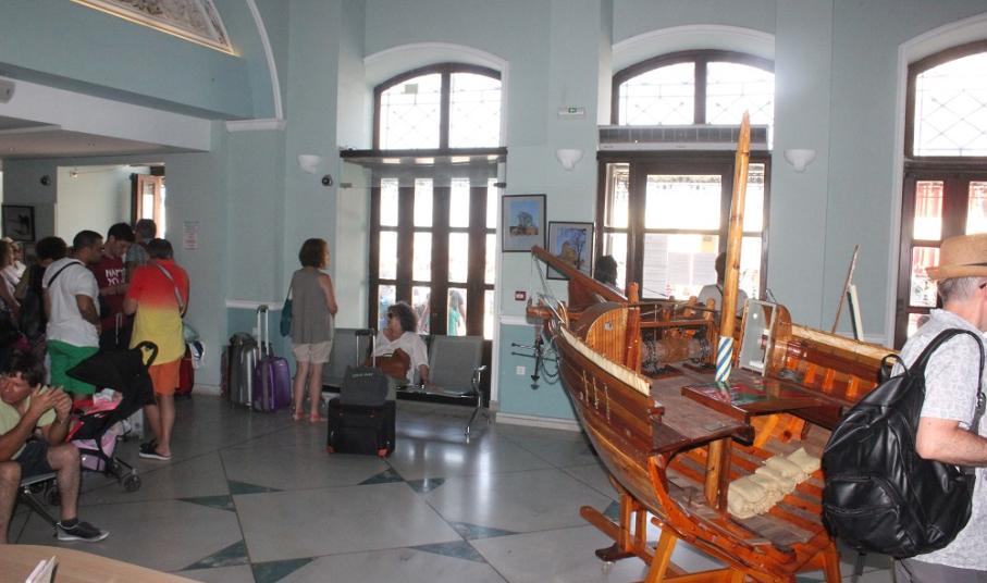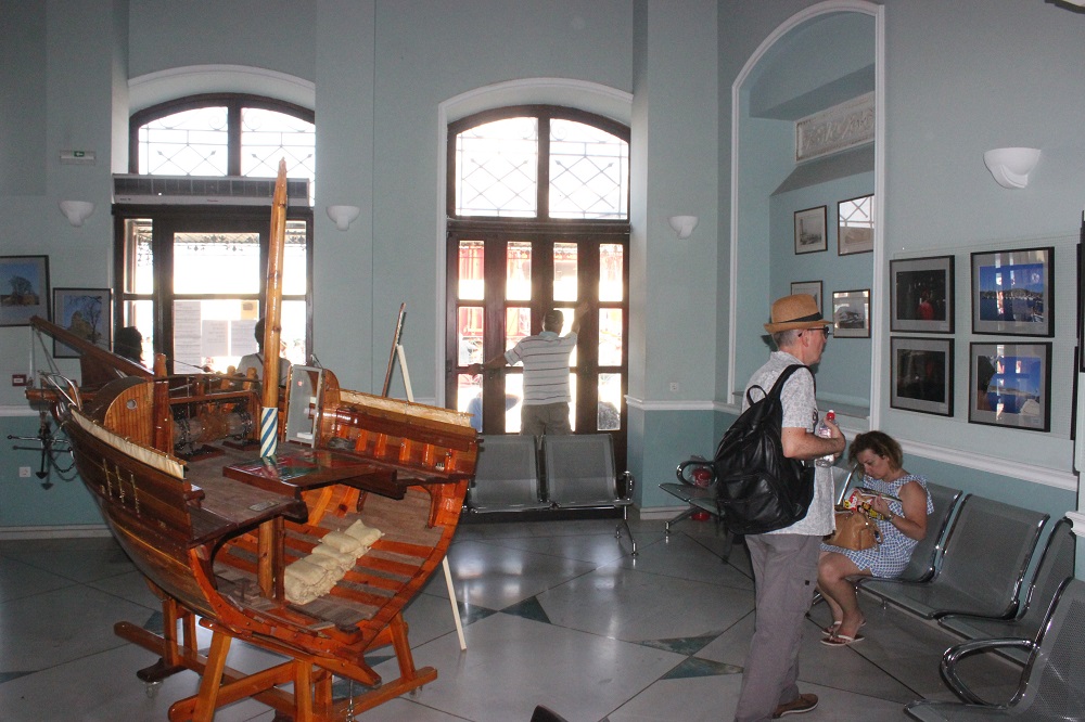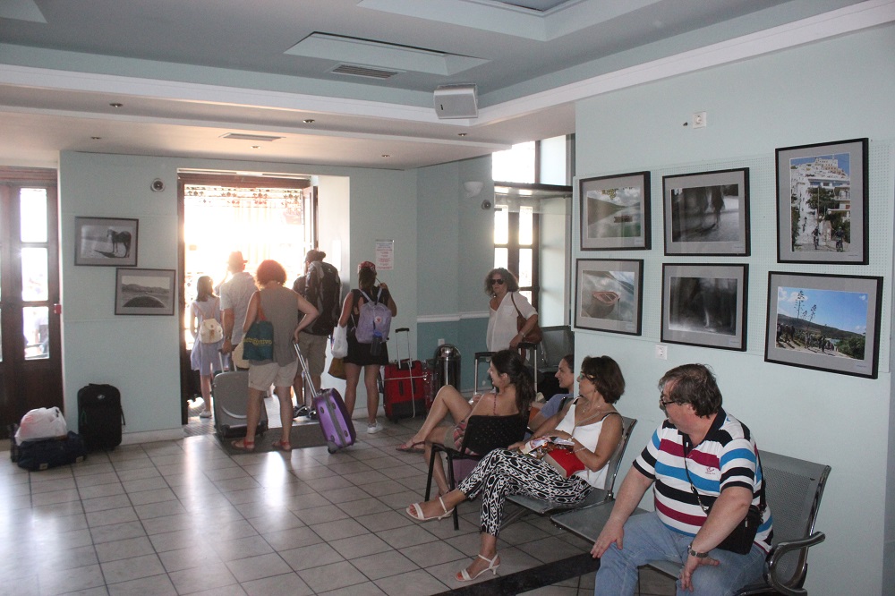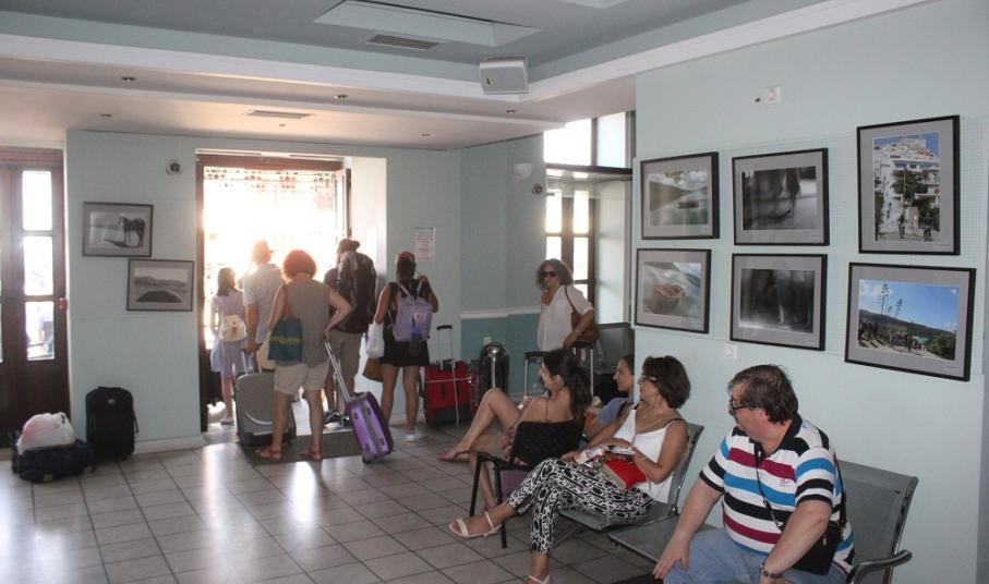 Η λαστιχομηχανή από το πλεκτήριο των Ζησιμάτου – Κωνσταντινόπουλου που έχει τοποθετηθεί στον Επιβατικό Σταθμό, καθώς επίσης το σχετικό φωτογραφικό υλικό που τη συνοδεύει αλλά και, οι εικόνες από τους παλαιούς ταρσανάδες της Σύρου, μα παράλληλα και εργαλεία των καραβομαραγκών που ανήκουν στις συλλογές του Βιομηχανικού Μουσείου Ερμούπολης κοσμούν την αίθουσα αναμονής και παραμένουν εδώ και πολλούς μήνες στη “θέση” τους, προσκαλώντας τους επισκέπτες να μεταβούν στους επισκέψιμους χώρους. Ταυτόχρονα, φωτογραφίες της Σύρου και ειδικότερα, της Άνω Σύρου αλλά και της Ερμούπολης και των χωριών, καθώς όμως και οι αφίσες των μουσείων του τόπου, προσελκύουν με τον δικό τους τρόπο τον επισκέπτη ενώ σε εμφανές σημείο υπάρχει το πολιτιστικό πρόγραμμα της θερινής περιόδου, το οποίο και μπορούν να προμηθεύονται οι ενδιαφερόμενοι.