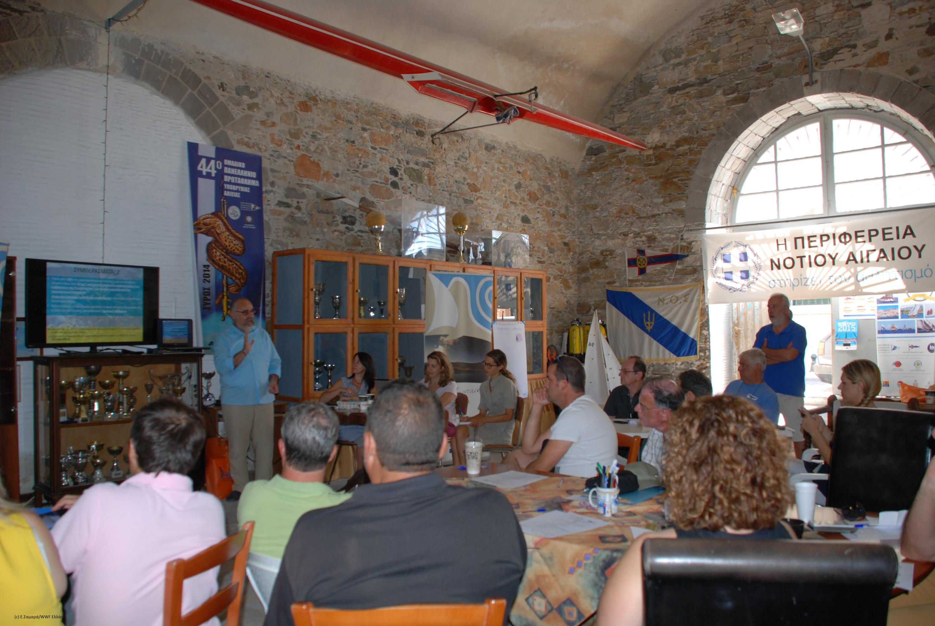 Τα μέλη της Επιτροπής, που αποτελείται από ψαράδες, φορείς που εκπροσωπούν την τοπική αυτοδιοίκηση, την πολιτεία, ερευνητικά ινστιτούτα, αναπτυξιακούς φορείς, πανεπιστήμια και ΜΚΟ έκαναν ερωτήσεις, χωρίστηκαν σε ομάδες εργασίας και δούλεψαν πάνω σε αυτά που έμαθαν, εξέφρασαν απορίες, σημείωσαν αυτά που τους έκαναν εντύπωση και συζήτησαν πώς θα μπορούσαν όλα τα παραπάνω δεδομένα να συμβάλουν στην προστασία και διαχείριση του νησιού. Επακολούθησε παρουσίαση των αποτελεσμάτων των ομάδων εργασίας στην Ολομέλεια οπότε και οι ερευνητές απάντησαν στα ερωτήματα που είχαν προκύψει.