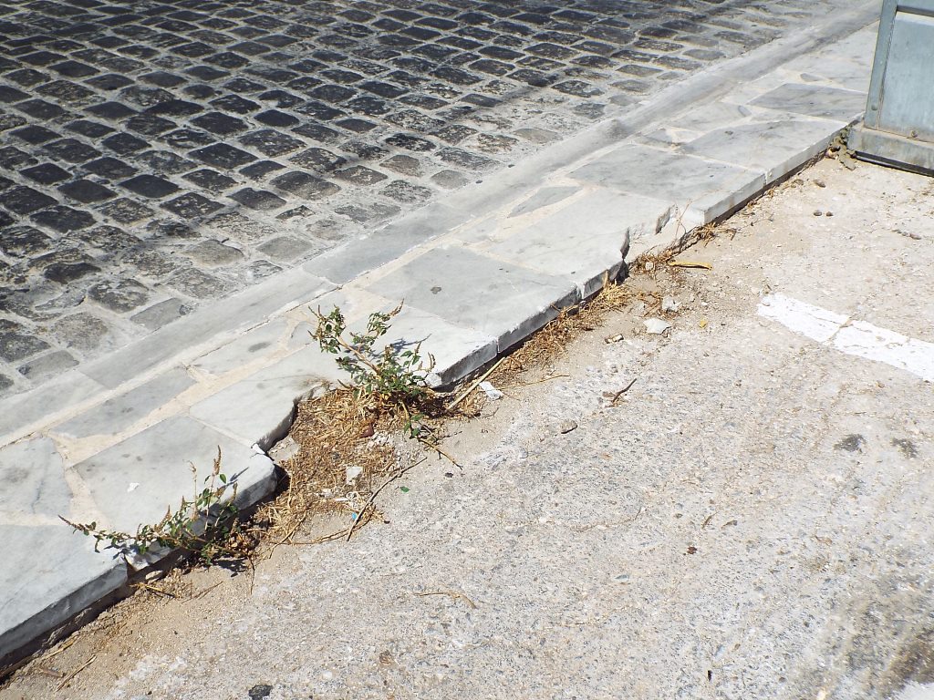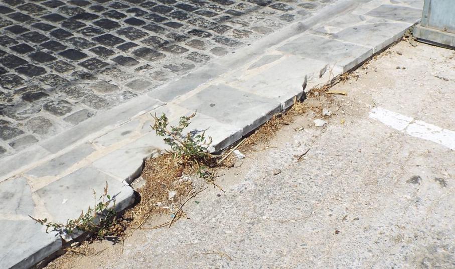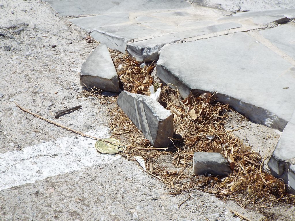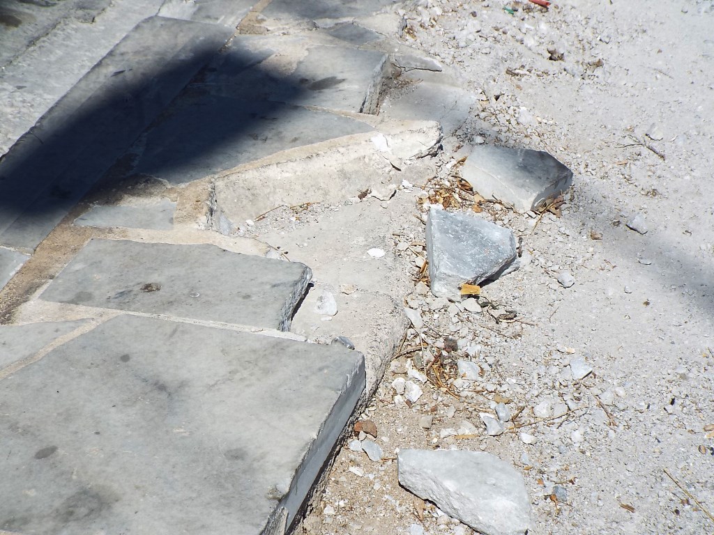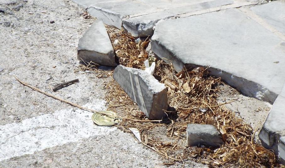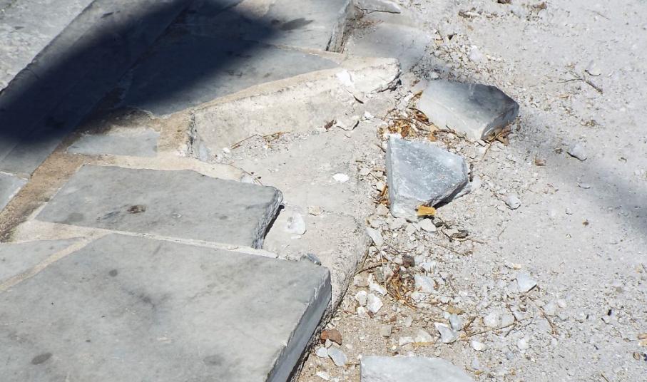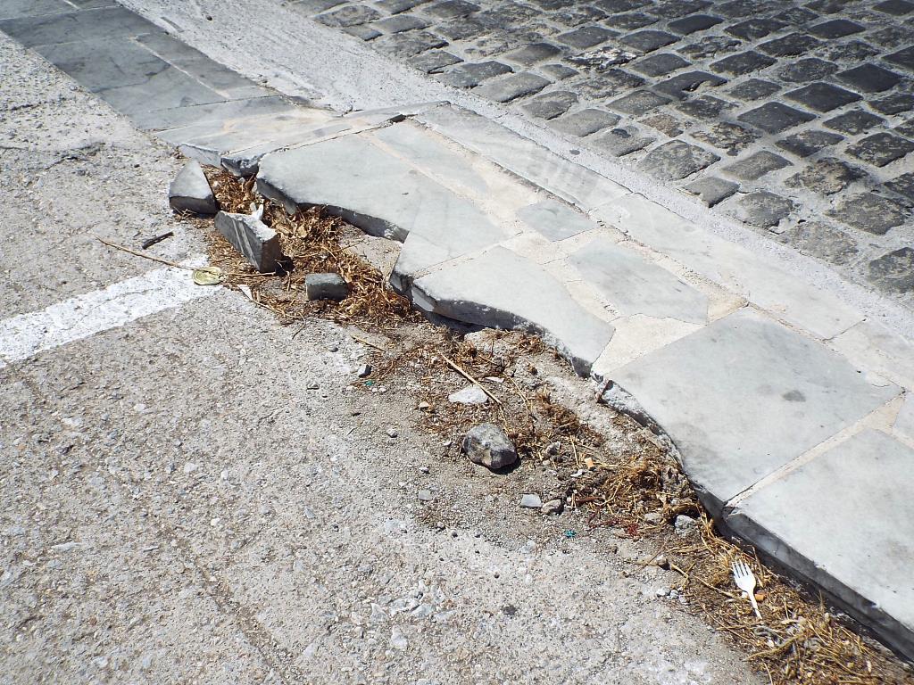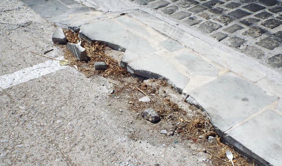Στο συγκεκριμένο χώρο, από τα νέα, σχετικά, πλακόστρωτα πεζοδρόμια, έχουν αποκολληθεί αρκετές μαρμάρινες πλάκες, οι οποίες βρίσκονται ακόμη στο σημείο, με κίνδυνο να προκαλέσουν βλάβη σε κάποιο ελαστικό, ενώ όσα τμήματα μαρμάρου αποκολλήθηκαν στη ράμπα εισόδου και εξόδου του πάρκινγκ έχουν καλυφθεί επιτόπια με άσφαλτο.