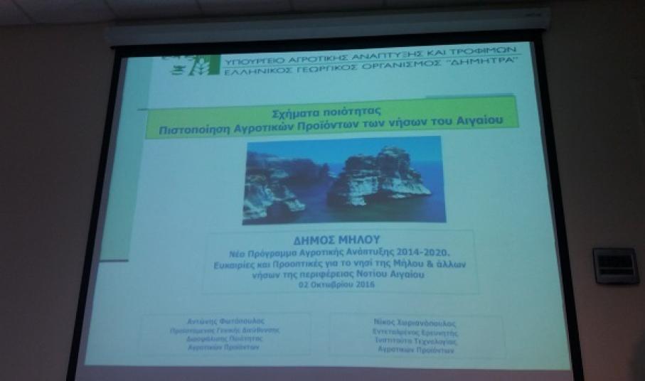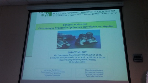 Με μεγάλη επιτυχία πραγματοποιήθηκε η ενημερωτική εκδήλωση με θέμα «Νέο Πρόγραμμα Αγροτικής Ανάπτυξης 2014-2020: Ευκαιρίες και προοπτικές για το νησί της Μήλου & άλλων νήσων της Περιφέρειας Νοτίου Αιγαίου» που έγινε την Κυριακή 2 Οκτωβρίου 2016 στο Συνεδριακό Κέντρο Μήλου «Γεώργιος Ηλιόπουλος».