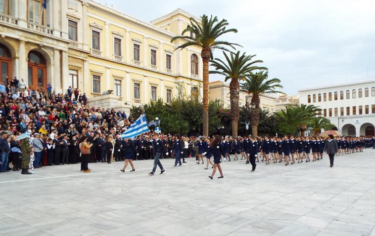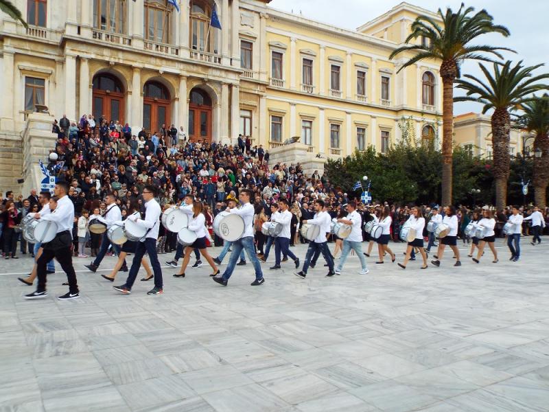 Αμέσως μετά, ακολούθησε η έναρξη της μαθητικής παρέλασης, η οποία, παρά τη μεγάλη συμμετοχή, τόσο από πλευράς μαθητών και μελών Συλλόγων και φορέων, όσο και από πλευράς θεατών, έμοιαζε φτωχότερη από προηγούμενες χρονιές, καθώς αισθητή έγινε η απουσία της Φιλαρμονικής του Δήμου Σύρου – Ερμούπολης, τα τμήματα της οποίας, λόγω των «αναταράξεων», του προηγούμενου διαστήματος, δεν κατέστη δυνατόν να προετοιμαστούν κατάλληλα.