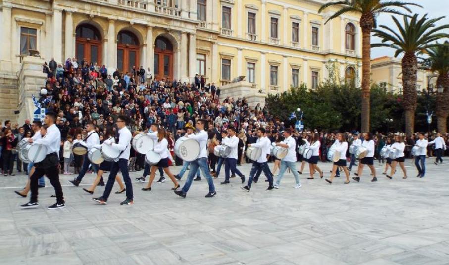 Στην παρέλαση συμμετείχαν μέλη του Λυκείου των Ελληνίδων Σύρου, του Συλλόγου Μικρασιατών Ερμούπολης Σύρου, του Πολιτιστικού Συλλόγου Κρητών Σύρου, του Συλλόγου Ποντίων και Βορειοελλαδιτών Σύρου «Ο Εύξεινος Πόντος», του Λαογραφικού Χορευτικού Ομίλου «η σοφία της παράδοσης», οι μαθητές των σχολείων όλων των βαθμίδων, οι σπουδαστές της Ακαδημίας Εμπορικού Ναυτικού Σύρου, μέλη του Ναυτικού Ομίλου Σύρου, του Αθλητικού Συλλόγου Tae Kwon Do Ερμούπολης και του Σώματος Ελλήνων Προσκόπων.