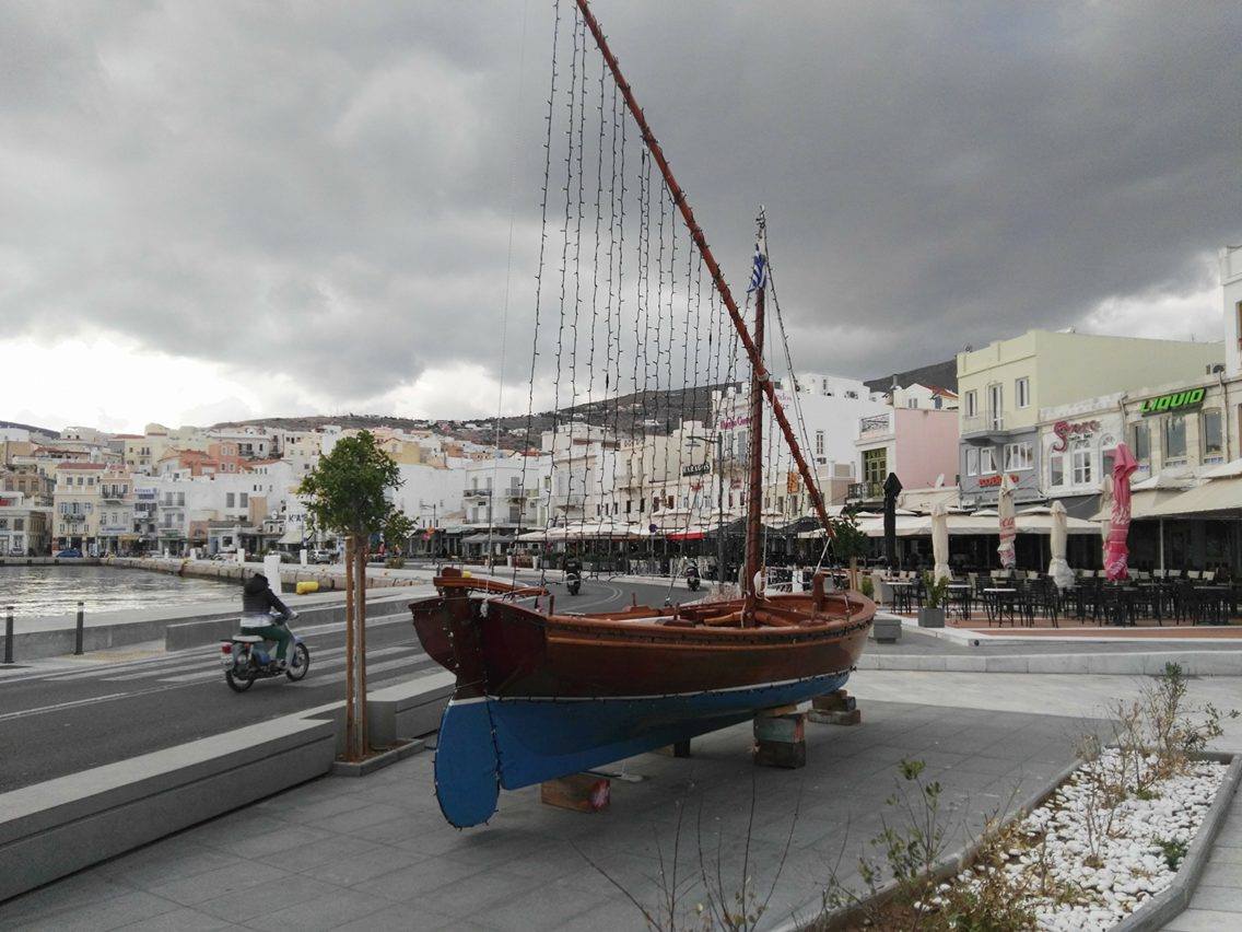 Το στολισμένο καραβάκι, τοποθετήθηκε και στολίστηκε στην παραλία της Ερμούπολης, σε συνεργασία με τον καραβομαραγκό, κ. Μανώλη Ζώρζο, η συμβολή του οποίου ζητήθηκε και δόθηκε και στη διακόσμηση του Επιβατικού Σταθμού στο λιμάνι, ενώ ανήκει στον ιατρό, κ. Χανδακά, ο οποίος και το παραχώρησε.