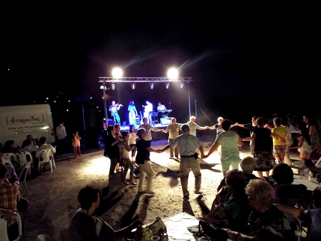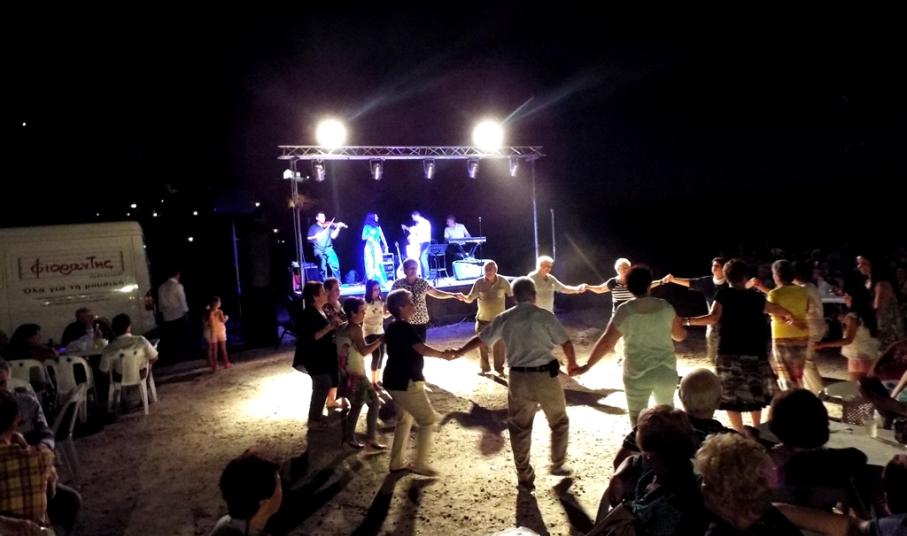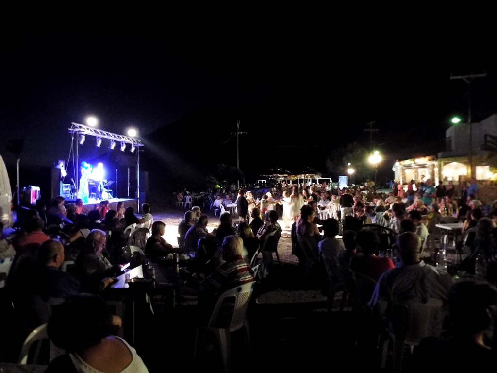 Στην πλευρά της παραλίας, είχαν από νωρίς στηθεί η σκηνή και τα τραπέζια και κατόπιν της θείας λειτουργίας, το χωριό κατακλύστηκε από νησιώτικα τραγούδα, που ερμήνευσε η ορχήστρα, αλλά και πλήθος κόσμου, ντόπιους και επισκέπτες, τους οποίους οι ψήστες, που είχαν ήδη ξεκινήσει τις προετοιμασίες, φίλευαν εδέσματα απευθείας από τα κάρβουνα.