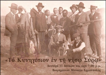 Ο Κυνηγετικός Σύλλογος Σύρου, ο Δήμος Σύρου – Ερμούπολης, ο Σύλλογος Φίλων Τεχνικού Πολιτισμού Ερμούπολης και το Βιομηχανικό Μουσείο Ερμούπολης διοργανώνουν την έκθεση «Το Κυνηγέσιον εν τη νήσω Σύρω».