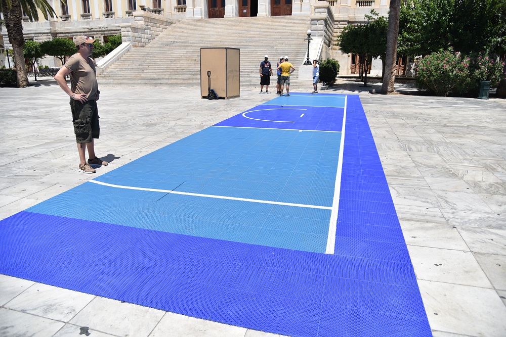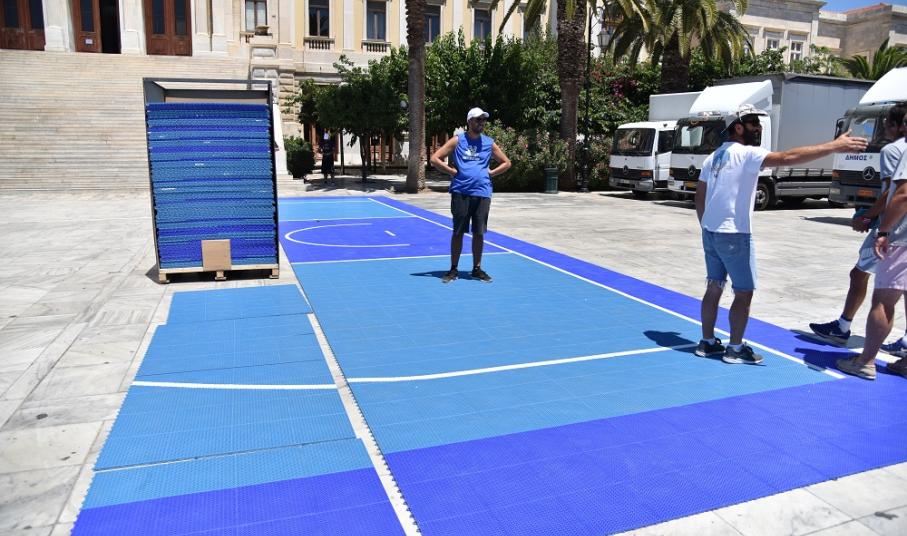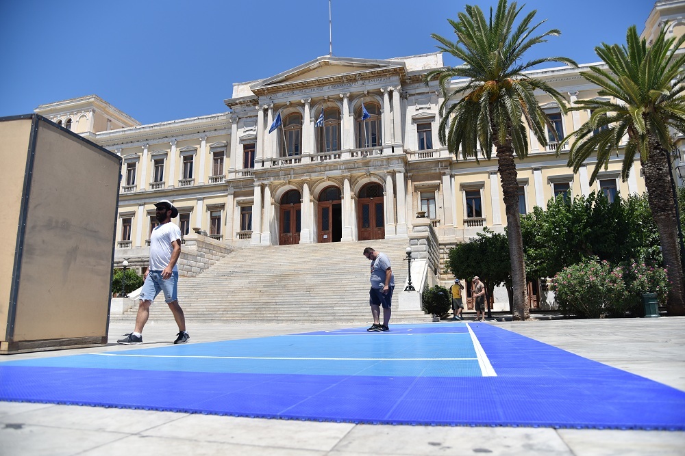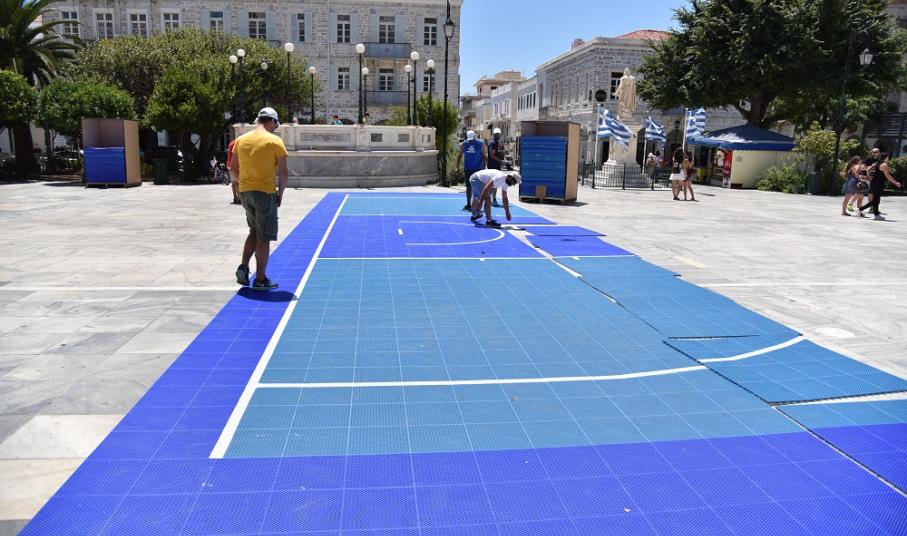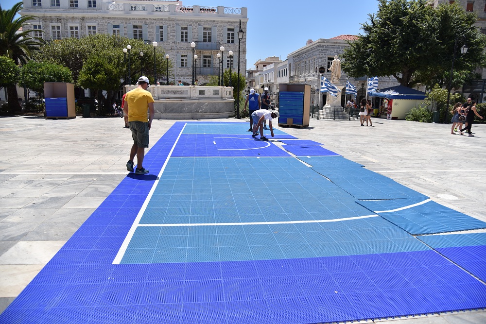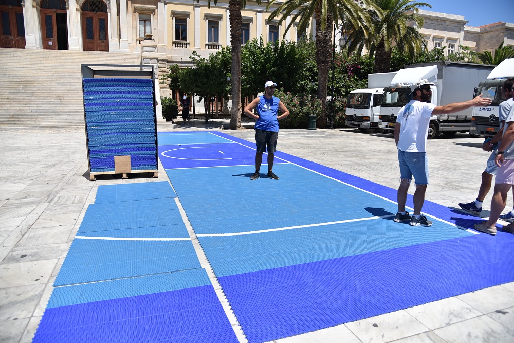 Οι εργασίες στην πλαστεία Μιαούλη ξεκίνησα από το πρωί της Κυριακής και κάθε ώρα που περνά τα ειδικά γήπεδα παίρνουν... σάρκα και οστά. Από την πρώτη στιγμή στην πλατεία Μιαούλη βρέθηκε ο Μιχάλης Φουντεδάκης, ο οποίος είναι ένας από τους υπευθύνους της διοργάνωσης, αλλά και ο πρόεδρος της επιτροπής αθλητισμού του δήμου Σύρου - Ερμούπολης Γουλιέλμος Πρίντεζης.