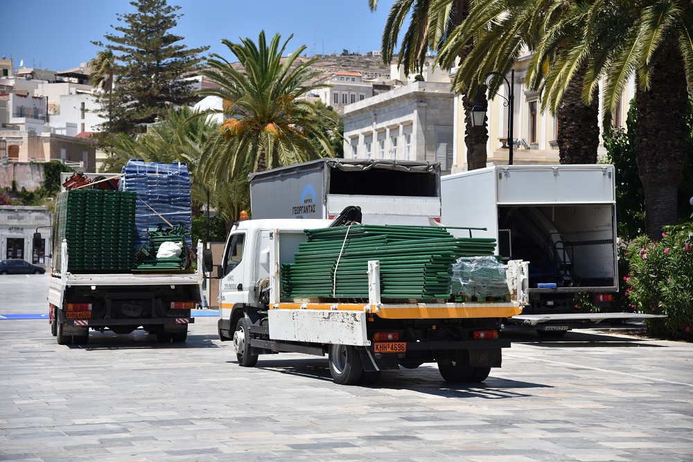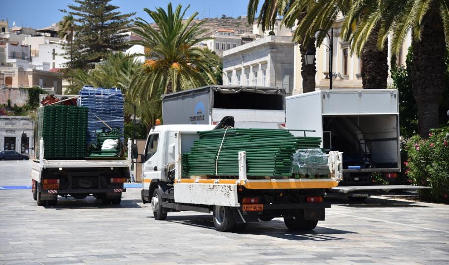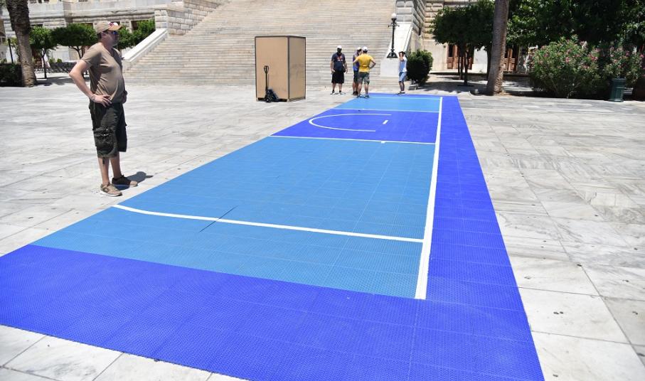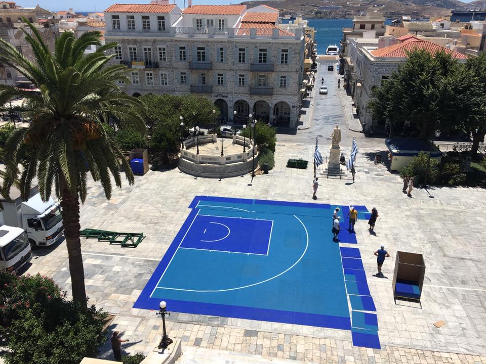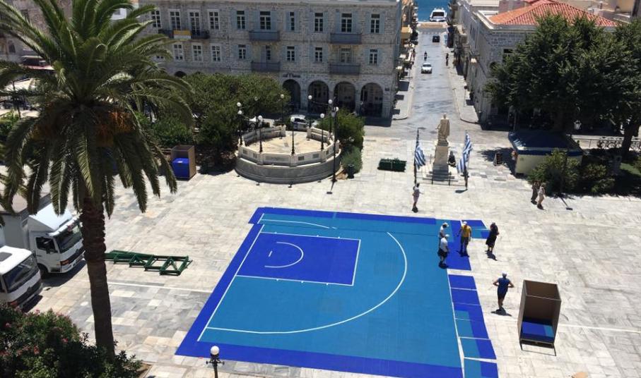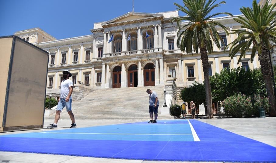 Οι εργασίες στην πλαστεία Μιαούλη ξεκίνησα από το πρωί της Κυριακής και κάθε ώρα που περνά τα ειδικά γήπεδα παίρνουν... σάρκα και οστά. Από την πρώτη στιγμή στην πλατεία Μιαούλη βρέθηκε ο Μιχάλης Φουντεδάκης, ο οποίος είναι ένας από τους υπευθύνους της διοργάνωσης, αλλά και ο πρόεδρος της επιτροπής αθλητισμού του δήμου Σύρου - Ερμούπολης Γουλιέλμος Πρίντεζης.