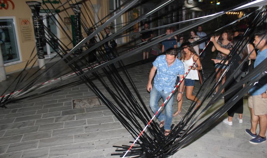 Στη συνέχεια, το κοινό κλήθηκε να μπει σε «ουρές» και να περάσει από διάφορες δοκιμασίες (κλειστά σύνορα με κορδέλες και μαύρες κολλητικές ταινίες) προκειμένου να φτάσει στη «Γη της Επαγγελίας», στα σημεία δηλαδή των video installation.