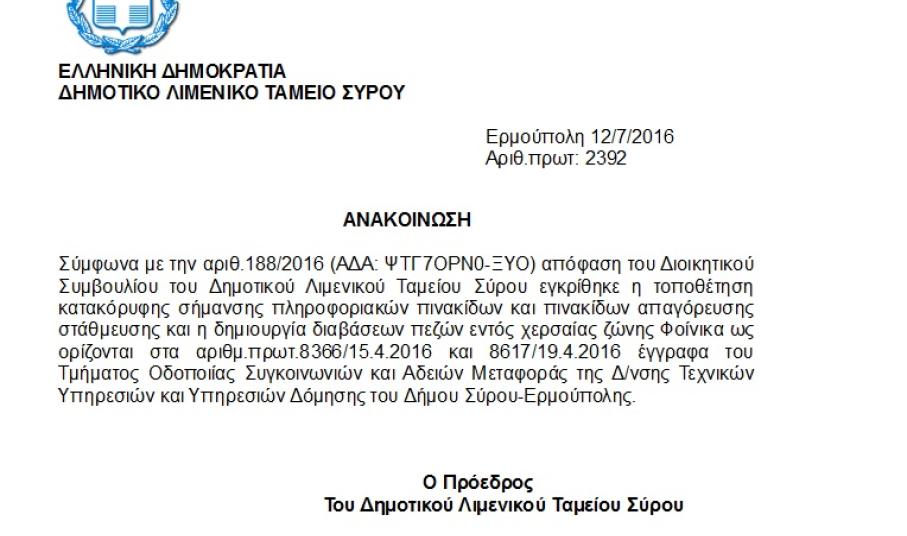 Τονίζεται πως, η πρόταση έχει διαβιβασθεί και στο Δημοτικό Λιμενικό Ταμείο Σύρου, καθώς αποτελεί το αρμόδιο όργανο για τη λήψη αποφάσεων και γνωμοδοτήσεων σε ζώνες αρμοδιότητάς του. Για το σύνολο των εργασιών κατά μήκος της παραλιακής οδού του Φοίνικα οι δαπάνες θα βαρύνουν κωδικό του προϋπολογισμού του Δήμου.