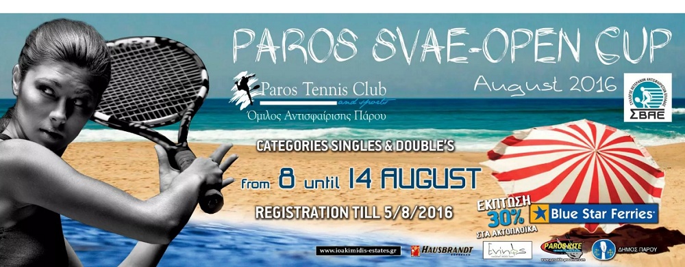 Ο όμιλος αντισφαίρισης Πάρου προκηρύσσει το Paros SVAE-Open Cup August 2016 το οποίο είναι combined τουρνουά Βετεράνων Ελλάδος και Open αντρών γυναικών το οποίο θα διεξαχθεί στις εγκαταστάσεις του Ομίλου στην Αγία Ειρήνη της Πάρου.