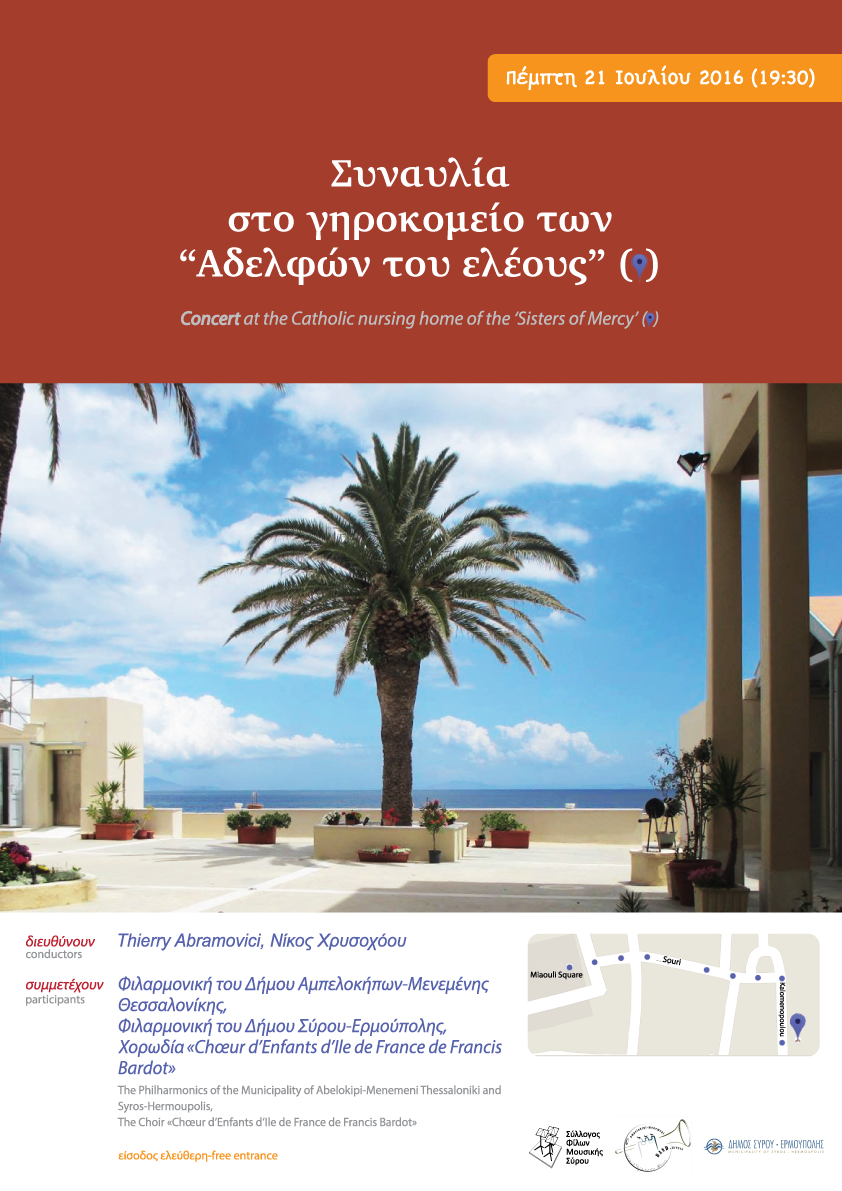 Ο Σύλλογος Φίλων Μουσικής Σύρου σας προσκαλεί σε συναυλία ορχήστρας πνευστών και κρουστών, αποτελούμενης από μουσικούς της Φιλαρμονικής Δήμου Aμπελοκήπων-Μενεμένης Θεσσαλονίκης, της παιδικής χορωδίας « Chœur d’Enfants d’Ile de France de Francis Bardot» αλλά και της Φιλαρμονικής του Δήμου Σύρου Ερμούπολη την Πέμπτη 21/07/2016 19:30 η ώρα στο πανέμορφο προαύλιο του καθολικού γηροκομείου των "Αδελφών του Ελέους".