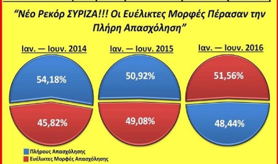 Για 10ετιες στη χώρα μας, επετεύχθη η ισορροπία μεταξύ των δυο αυτών μορφών απασχόλησης, με την πλήρη όμως απασχόληση να υπερτερεί. Ισορροπία που σήμερα ανετράπη από τους ΣΥΡΙΖΑ-ΑΝΕΛ. Αξίζει να σημειωθεί, ότι ο ΣΥΡΙΖΑ, ως αντιπολίτευση ασκούσε καθημερινά δριμύτατη κριτική στην εικόνα που παρουσίαζε -επί Ν.Δ.- η αγορά εργασίας, την οποία μάλιστα χαρακτήριζε ως εργασιακή “ζούγκλα” και “μεσαίωνα”. Ήταν η περίοδος που υπόσχονταν σε εργαζομένους και ανέργους την πλήρη κατάργηση κάθε ευέλικτης μορφής απασχόλησης, πλήρη απασχόληση για όλους και 751 ευρώ κατώτατο μισθό για όλους!