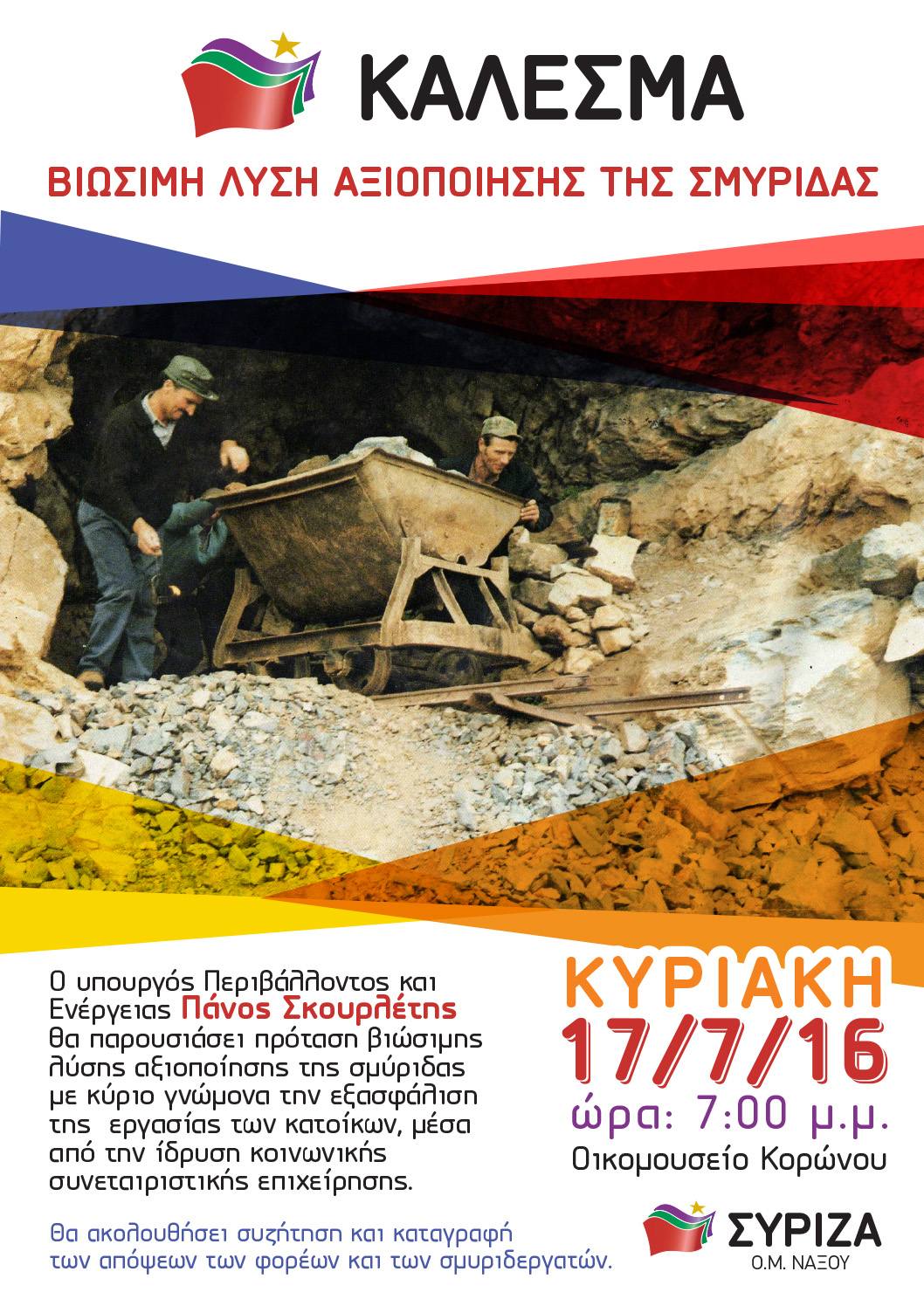 Η Οργάνωση Μελών ΣΥΡΙΖΑ Νάξου καλεί τους σμυριδεργάτες της ορεινής Νάξου σε συγκέντρωση στο Οικομουσείο Κορώνου τη Κυριακή 17/7/2016 στις 7μ.μ.