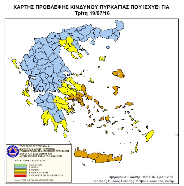Η Αυτοτελής Διεύθυνση Πολιτικής Προστασίας της Περιφέρειας Νοτίου Αιγαίου ενημερώνει ότι, την Τρίτη 19-7-2016 και σύμφωνα με τον Ημερήσιο Χάρτη Πρόβλεψης Κινδύνου Πυρκαγιάς που συντάσσει η Διεύθυνση Σχεδιασμού και Αντιμετώπισης Έκτακτων Αναγκών της Γενικής Γραμματείας Πολιτικής Προστασίας, που εκδόθηκε την Δευτέρα 18-7-2016, ο κίνδυνος για την εκδήλωση πυρκαγιών στην Περιφέρεια Νοτίου Αιγαίου (Π.Ε. Κυκλάδων) είναι πολύ υψηλός (Κατηγορία κινδύνου 4) και όλες οι αρμόδιες υπηρεσίες βρίσκονται σε κατάσταση αυξημένης ετοιμότητας.